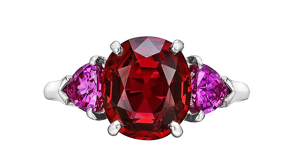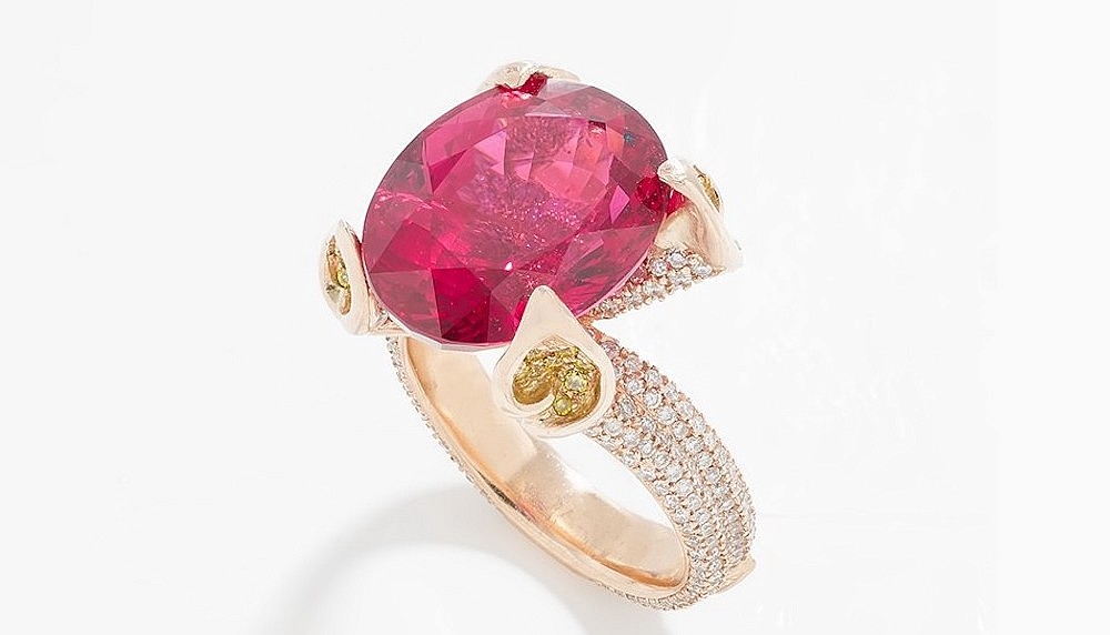 Mumbai’s Coomi Bhasin frequently works colourful pink spinel into her ornate designs. This handcrafted ring centres on a luminous 13-carat pink spinel that is framed with four petite yellow diamonds and set on a diamond band. Meanwhile, this 18-karat white-and-rose-gold ring from New York’s Spark Creations centres on a pear-shaped, pink-hued spinel framed with white diamonds.