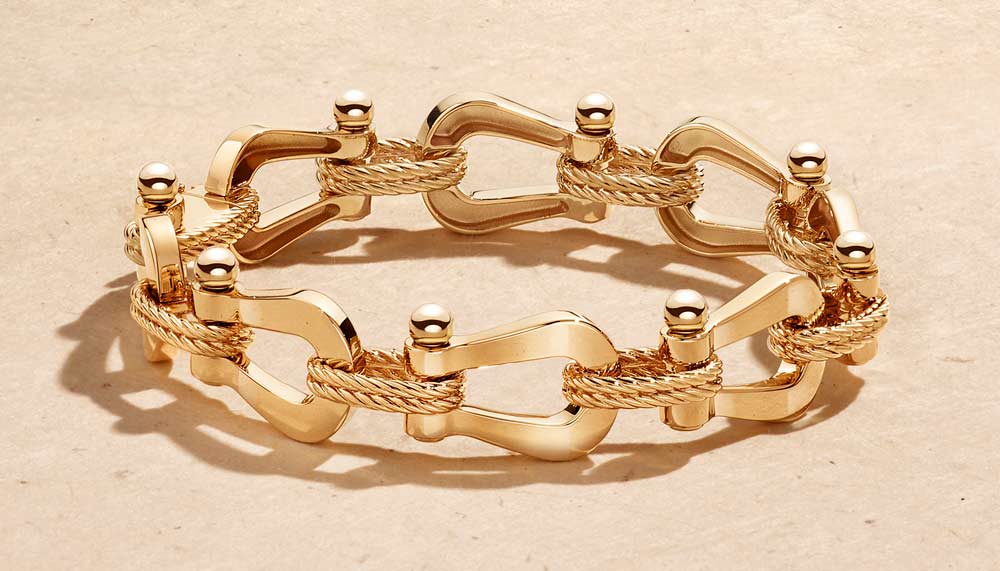 When Fred Samuel’s son tinkered around with some yacht cable and rivets in 1966, he merely wanted to create a humble bracelet for his wife’s birthday present. Never did he expect that his homemade gift would eventually inspire a bestselling icon – the Force 10 bracelet – in his father’s eponymous jewellery house. The latest addition to the Force 10 line is the Force 10 Multi-buckle bracelet, an extravagant version in full yellow gold. The line’s signature buckle, inspired by boating snap shackles, is now used as a repeated motif, connected by gold links styled as the original Force 10 rope cable.