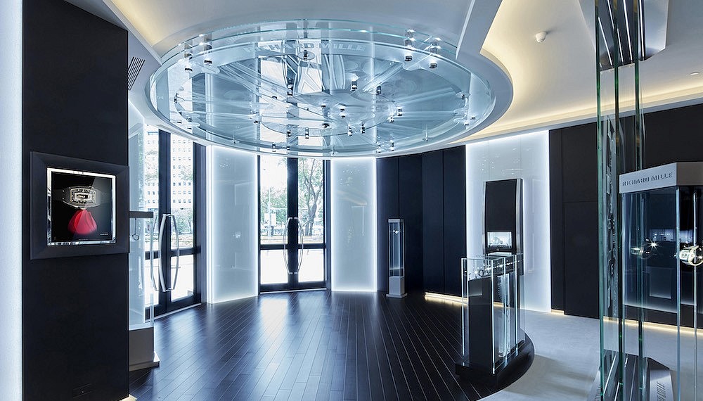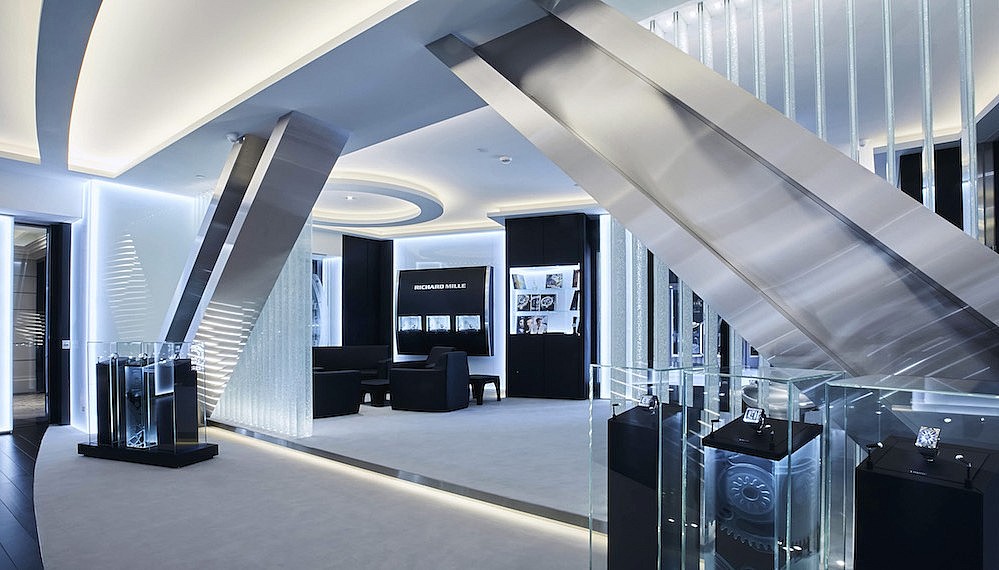 At the heart of the boutique stands a proud nod to a timepiece past, a glass monument of the classic RM 033. Sculpted in four layers of tempered glass, its filters and beams light throughout the boutique and across the 45 showcases.