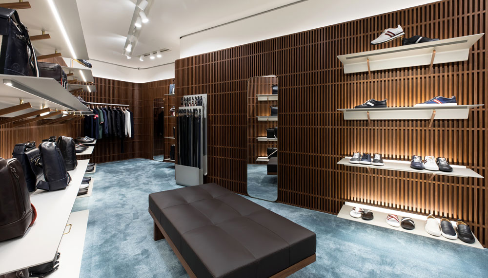 When approaching the store, the first thing that meets the eye are elegant double glass doors, accentuated by the brand’s classic red marble plinths. The women’s collection is arranged on the ground floor, adorned by pink velvet walls; with the men’s displayed on the floor above against blue velvet.