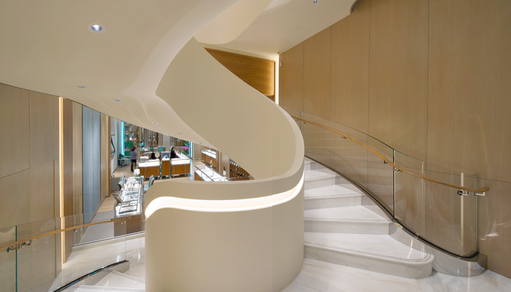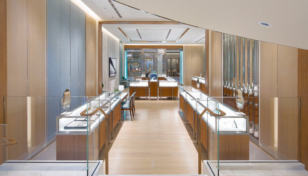 Each of the sections, which showcase an assortment of diamonds and colourful gemstones including Tiffany’s celebrated diamond engagement rings, feature details which allude to the brand’s New York heritage. In the fine jewellery salon, for instance, a dark green marble band in the stone flooring harks back to their Fifth Avenue flagship. Similarly, a wall of hand-painted and gilded Tiffany Magnolia glass panels take their inspiration from Louis Comfort Tiffany’s original stained glass windows at the Metropolitan Museum of Art in New York.