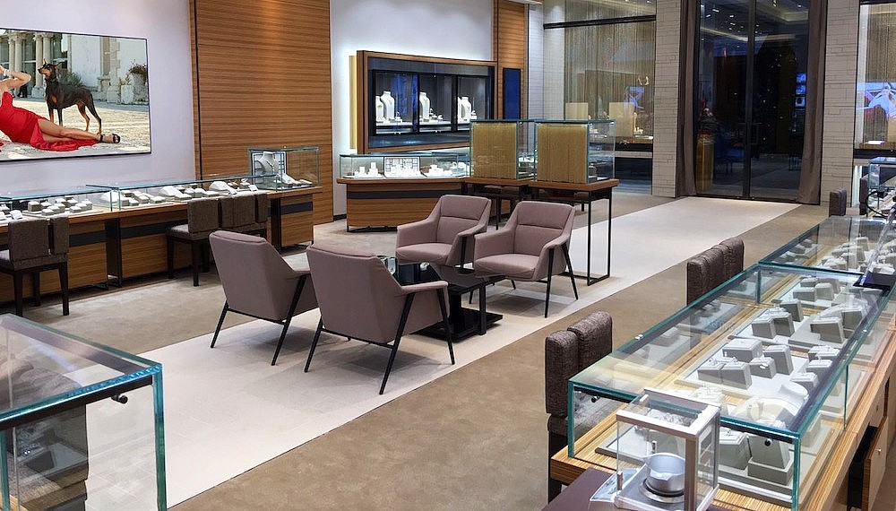 A private VIP zone offers clients an added dimension of hospitality and privacy. Here, they may view the many collections by TSL such as the playful butterfly-inspired Farfalla collection of black and white diamond pendants in 18-carat white gold, and the sumptuous white diamond necklace under its Radiance collection.