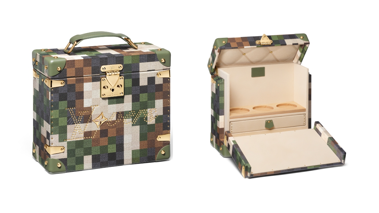 The bottle is moulded in the signature Louis Vuitton Les Parfums cylindrical silhouette, alongside a prismatic finish that manipulates the sunlight. Accompanying the LVERS fragrance are the new green Damoflage travel case and fragrance trunk.