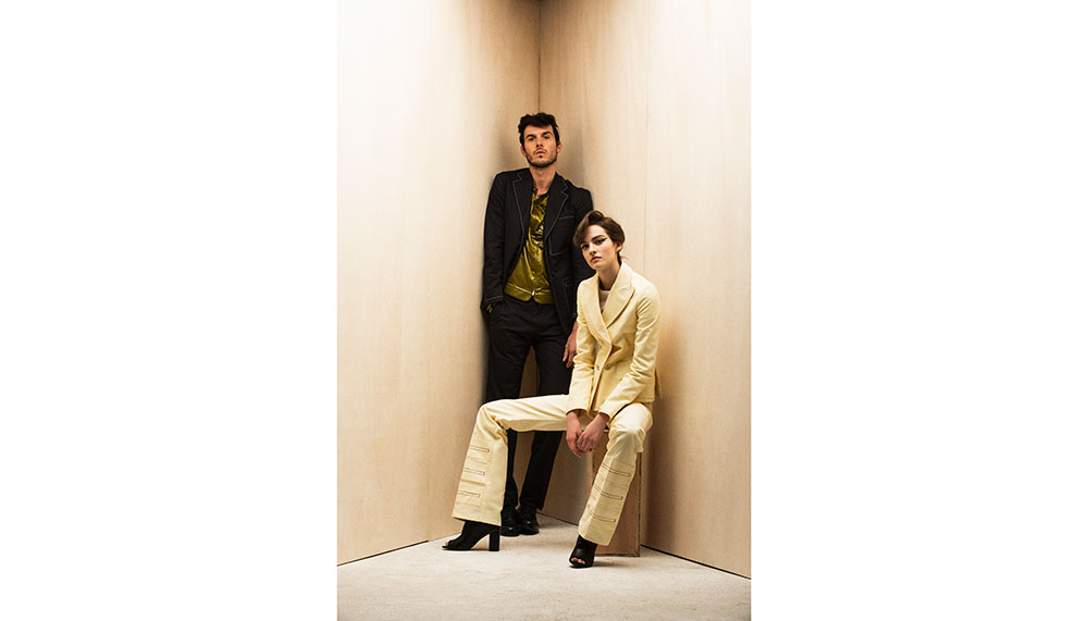 Her: Cotton double-breasted jacket, cotton trousers, cotton T-shirt and calfskin boots