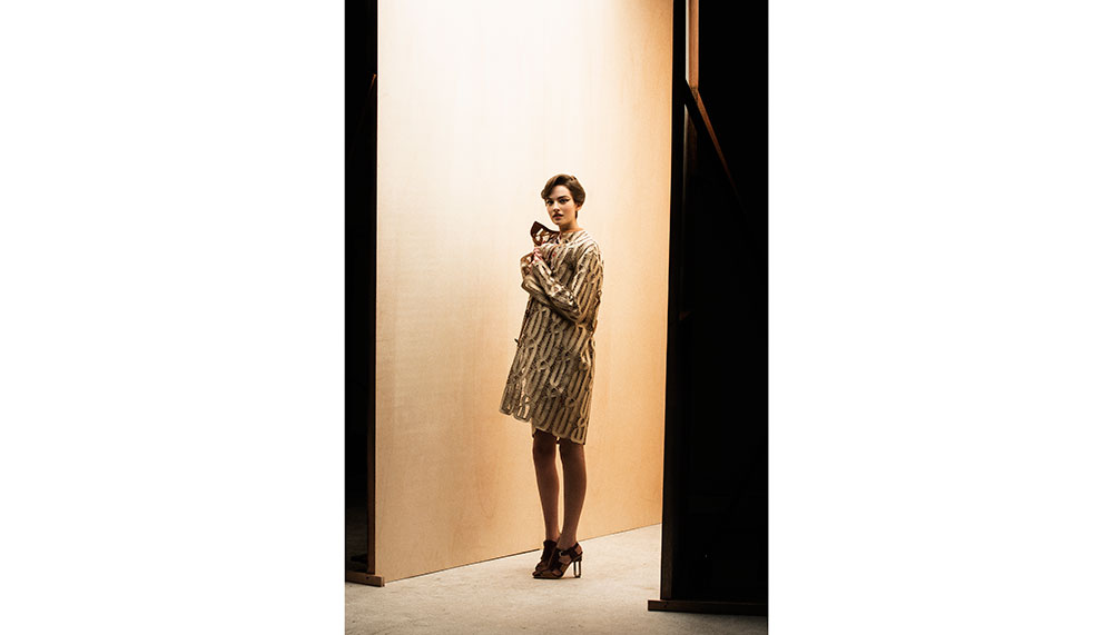 Her: Silk jacquard dress and calfskin sandals