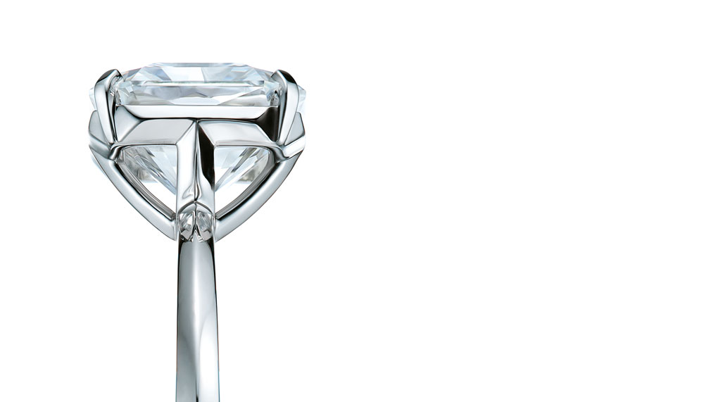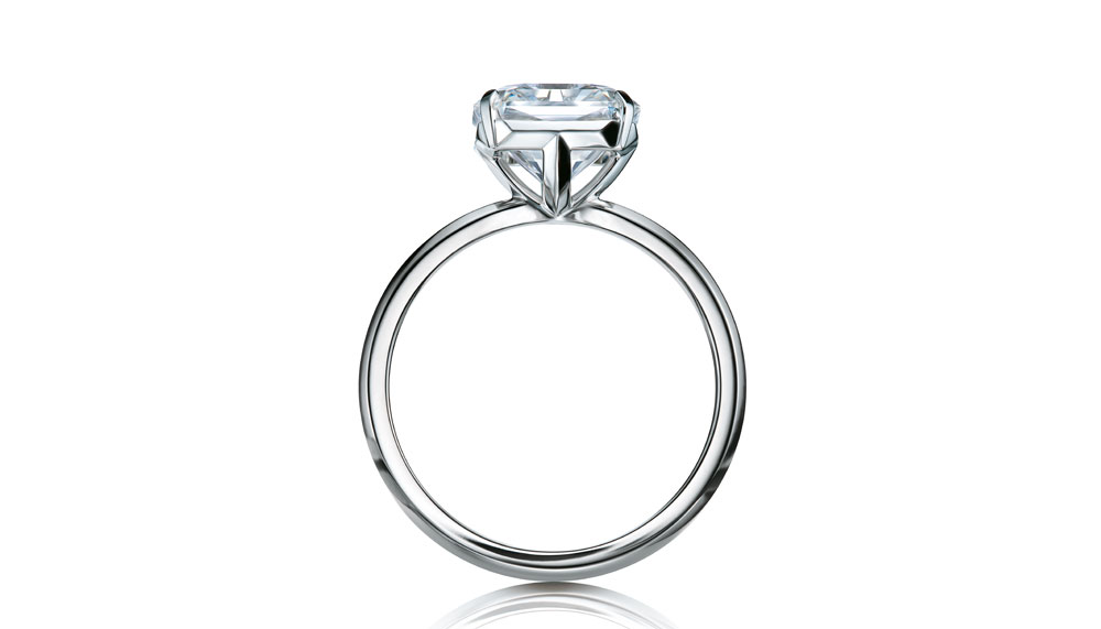 Held by a delicate four-pronged setting, the entire band is sculpted for the diamond to sit close to the finger. And when viewed closely, the design reveals a subtle “T” motif privy only to the wearer.