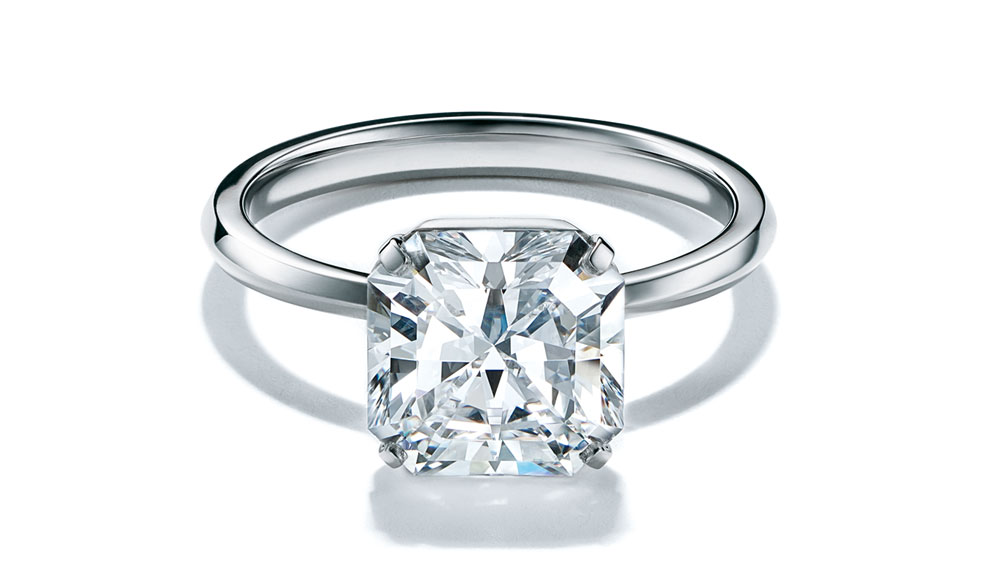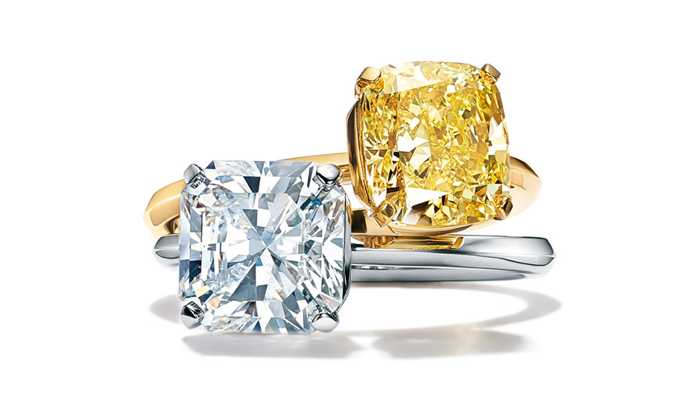 Featuring white and yellow diamonds, Tiffany True stones are brilliant-cut at the base to reflect light, while the crown has parallel facets to diffuse that brilliance. This new fancy-cut diamond exposes more surface area for heightened contrast, favouring beauty over weight.