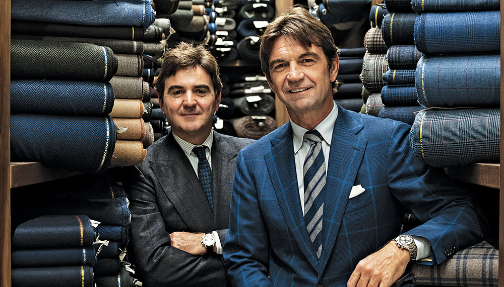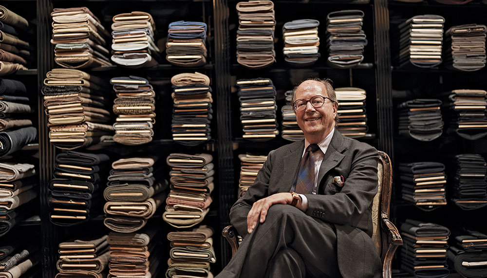 Individuality is also a driving force at Rubinacci, whose bespoke suits are offered through its stores in Naples, Milan, and London. Established by Gennaro Rubinacci in 1930, the company is now helmed by Gennaro’s son Mariano, who runs the business with his son Luca. On a floor above their Naples shop, more than two dozen tailors, all dressed in white coats, cut and sew each garment by hand. These methods allow for the creation of uniquely personalized garments, such as a recent Tanzanian client’s lightweight cashmere sport coat lined with a silk print featuring an image of Mount Vesuvius. More than ever, says Mariano, “people want something special; they don’t want something everyone else has.”