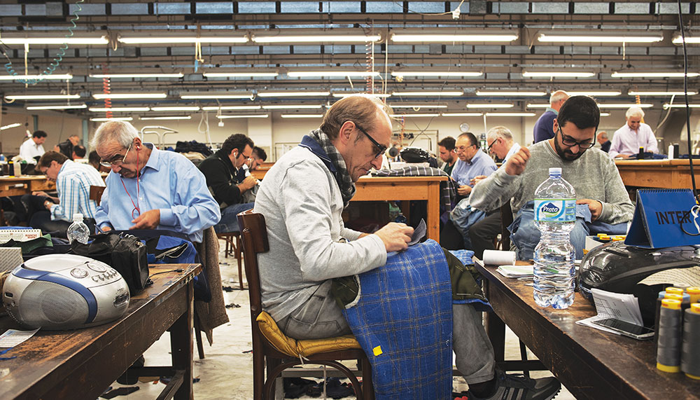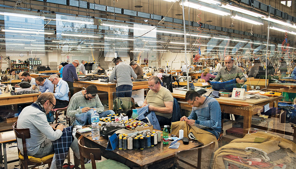Inside Kiton’s workshop, 350 tailors (most of them men) work in groups according to their skill set. A circle of about eight artisans might sew the shoulders, for example, while another group attaches collars. The atmosphere feels more like a men’s club than a workshop, and the close-knit family of Ciro Paone, who founded the brand in 1968, oversees the work and the company’s international growth. “All the family is in the business, and I expect my son and daughter will join one day,” says Ciro’s daughter Maria Giovanna Paone, who is Kiton’s vice president and the creative director of its women’s division. The spirit of Naples is evident in everything the company makes, she says, noting that the tailors put their own personality into each handmade jacket.