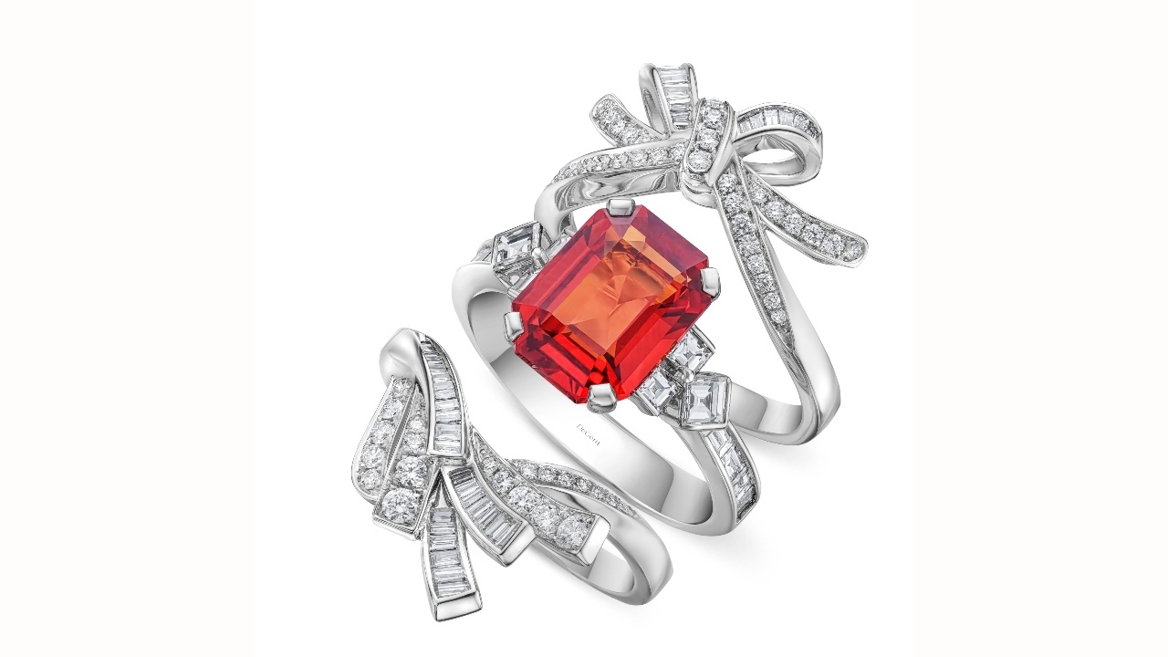 DeGem’s Morphe Rings are bejewelled with centre stones that showcase some of nature’s most sought-after kaleidoscopic treasures, reflecting DeGem’s long-standing philosophy in global gemstone sourcing and stringent beauty standards. A 4.32-carat octagon sapphire, the ardent Orange Sapphire ring is surrounded by 19 tapered and 21 round brilliant diamonds, while the rosette Pink Sapphire is set in 18k white gold with a 2.89-carat cushion-cut sapphire. Also in 18k white gold, the ethereal Padparadscha Sapphire is bundled with a 2.72-carat cushion-cut sapphire, alongside the spellbinding Emerald ring decked with 2.05-carat octagon emerald. Lastly, the soulful Tanzanite ring boasts a 2.9-carat octagon tanzanite, accented with one baguette diamond and four brilliant diamonds. Each Morphe ring jacket is customisable, allowing for effortless stacking with any chosen gemstone ring, which results in three-dimensional marvels.