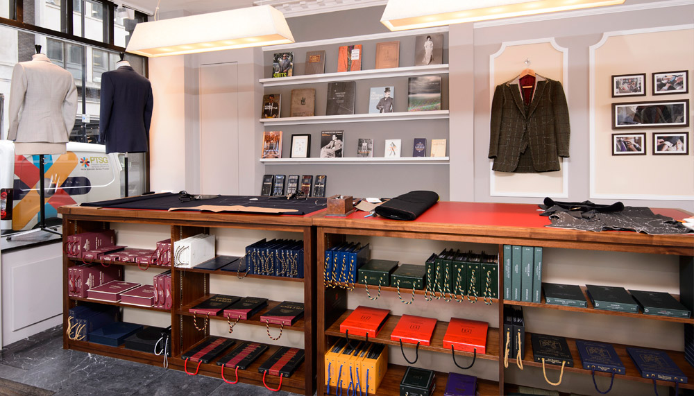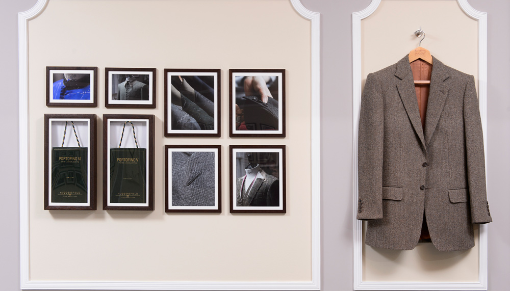 Hanging on the wall are pattern swatches encased in Lucite along with the names of the notables – David Chipperfield, Daniel Craig, Jacquelyn Kennedy Onassis – who wore them.