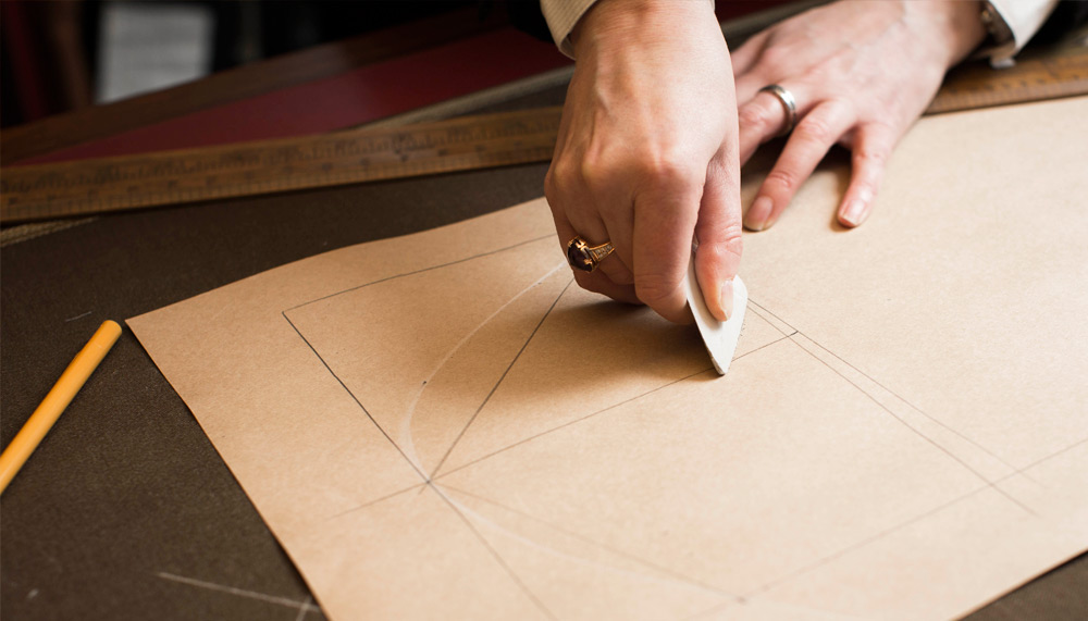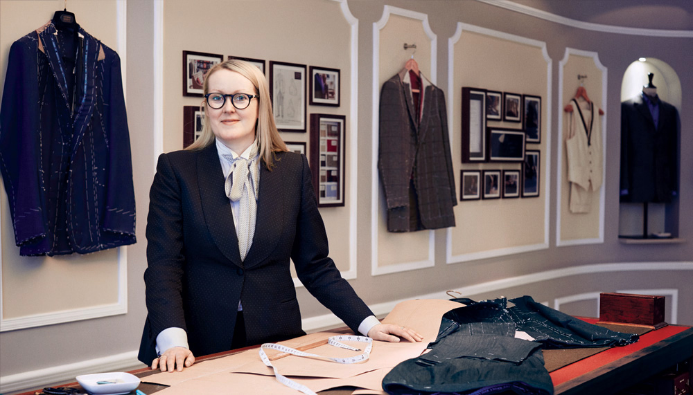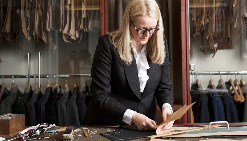 Among the other new establishments on the Row is No. 37, where Sargent is preserving the traditions of bespoke tailoring while dispelling any antiquated notion that the trade is for men only. Having spent 15 years at Gieves & Hawkes, where she became the Row’s first female head cutter, she opened her own shop, which she wanted to feel welcoming. “There’s such a mystique around Savile Row; I didn’t want anyone to feel intimidated coming in,” she explains. “I just put myself in their shoes.” Her store has brightly lit interiors and an open layout, and she strategically placed the cutting table in the front window so that the passing public can glimpse her or one of her staff members cutting patterns. She works closely with each client to offer suiting that meets the individual’s needs, whether that means traditional formal or new casual. “The days of your father taking you to his tailor are over,” says Sargent. “Savile Row has evolved and will keep evolving, and I think I’m part of the evolution. I’m very proud of it.”