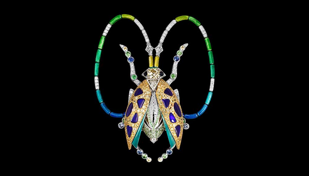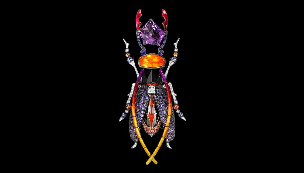 The brooches – only three were created – display brilliant gemstones and bright enamel details, which mimic the insect’s metallic sheen. The modern scarabs feature diamonds, sapphires, tsavorites. fire opals, amethysts, black and white diamonds. Bäumer drew inspiration from ancient designs, particularly scarab jewellery he saw in a Cairo museum a few years ago. But for the designer, the actual insects hold their own allure: “They are so beautiful that you think someone designed and painted them,” he says. “It’s hard to believe they are natural.”