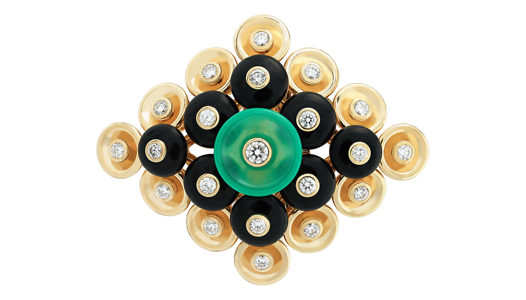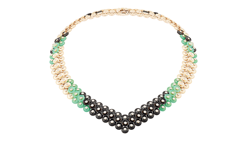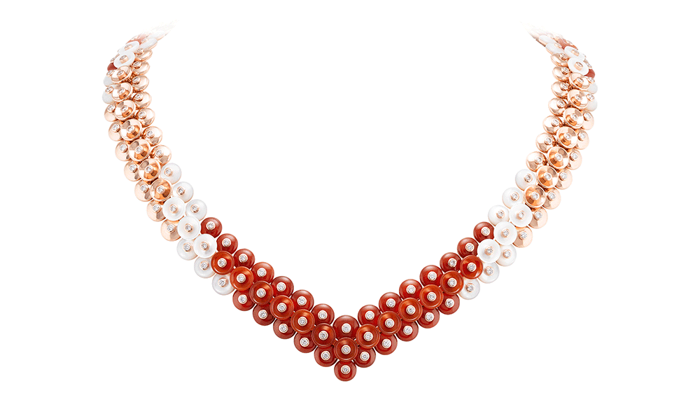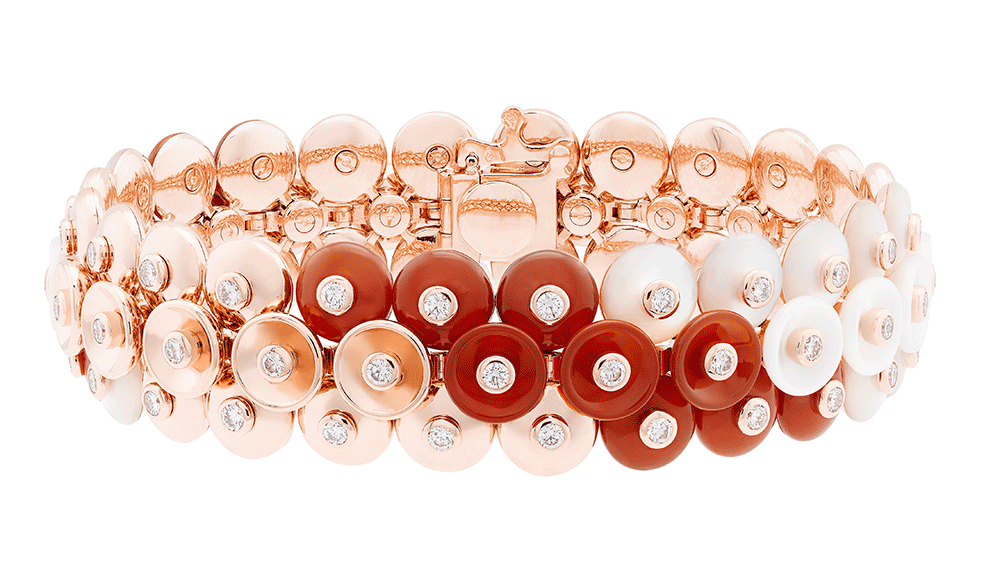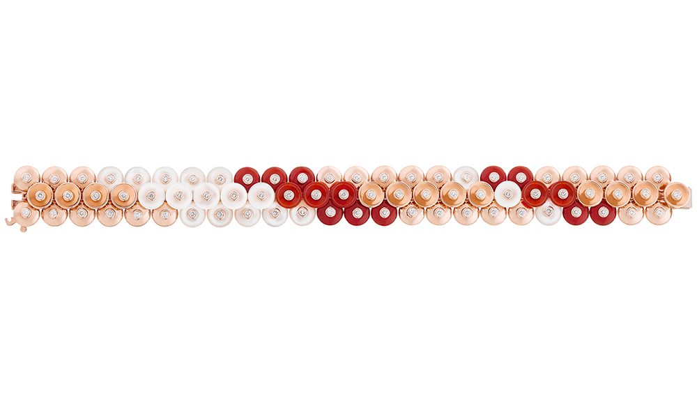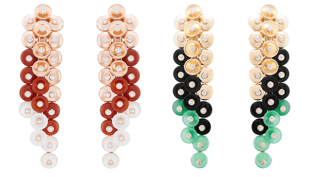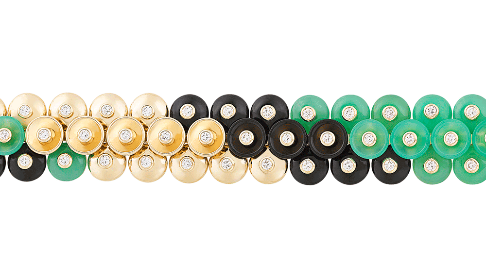 The collection is distinguished by two different sets; the carnelian stands out with a warm undertone of pink gold and mother of pearl, while the onyx and chrysoprase pastilles are contrasted by a light yellow gold.