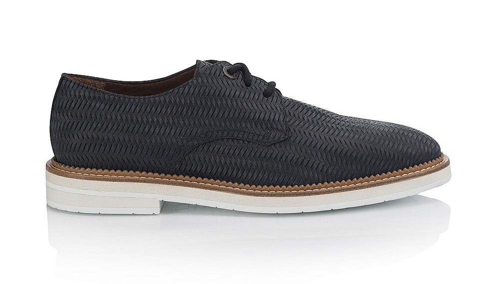 The men’s line from Jimmy Choo also takes cues from its sky-high stiletto designs by incorporating playful textures into classically masculine styles. For spring, the brand has reimagined the loafer and the derby in intricately woven suede, lending a more casual air to the typically buttoned-up styles. Both designs also feature cheeky details, like a gunmetal penny slotted into the loafers or a scalloped leather sole to further soften the traditionally chunky derby.