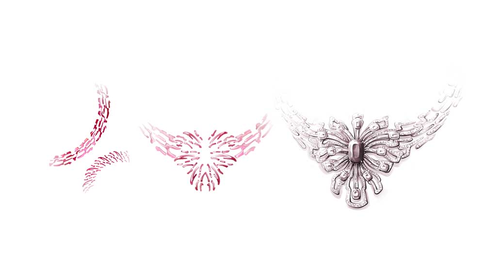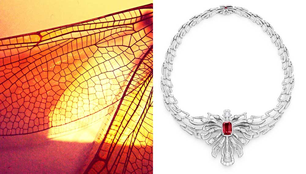 The piece that will undoubtedly light up any and all occasions, however, is the Wings of a Dragonfly necklace: an awe-inspiring design crafted from 1,788 brilliant-cut diamonds, 43 fancy-shape diamonds, 13 cushion-shape diamonds totaling 6.02 carats, and a smouldering 10.64 carat, cushion-shape Burmese ruby as its centrepiece. Stemming from a ruby inclusion’s arching, cell-like patterns – so finely structured that it can only be compared to a dragonfly’s wing – it is an intricately wrought testament to Gübelin’s masterful craftsmanship, and an aesthetic philosophy that opens our eyes to a fascinating, undiscovered world.