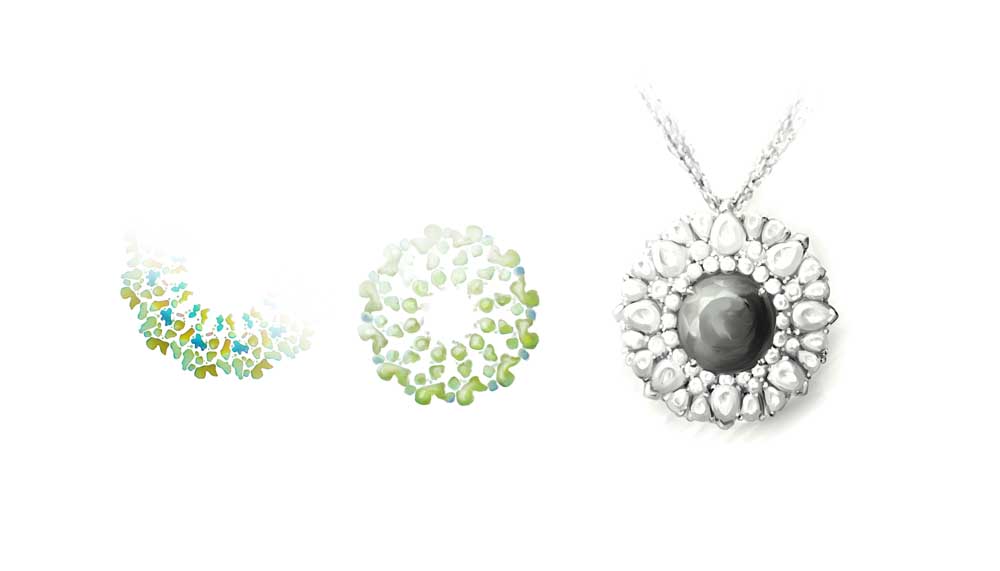 Through Gübelin’s eyes, a rare, round 2.84 carat Colombian emerald strung on a platinum necklace – an entrancing piece from their Ornament of Flowers line, under the Pioneer Collection – is the vista to a Mystical Garden, aptly framed by 24 pear-shaped diamonds and 92 brilliant-cut diamonds. Beneath its lush green surface lie inclusions that resemble the botanical forms of delicate fronds, shining petals, and tranquil forests – a wondrous realm within the heart of the stone.