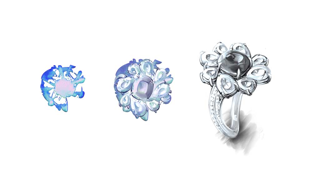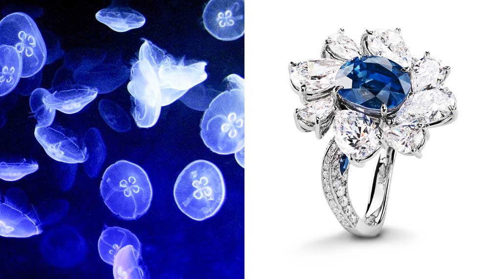 Plunging into the Deep Sea, the Glowing Jellyfish ring, which features a 3.78 carat oval Kashmir sapphire, conjures up images of undulating sea creatures, rising bubbles, and ancient coral reefs when viewed up close. The explosive centres of zircon crystals (which typically appear as inclusions in sapphires) serve as inspiration for the orbiting forms of the ring’s design, bringing to mind the solitary, waiflike glow of a jellyfish in the mysterious dark blue of the ocean.