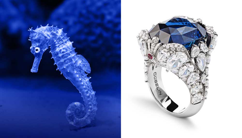 Similarly, The Story of the Seahorse sapphire ring – one of a series of masterpieces by Gübelin’s designers – alludes to a curling sapphire inclusion that resembles the shape of a seahorse. With two dramatic diamond vertebrae forming a seductively curvaceous spine for a 23.23 carat cushion-shape sapphire from Sri Lanka, the contrast between the sparkling blue, one-of-a-kind gemstone and the 32 pear-shaped diamonds that surround it make quite a sight.