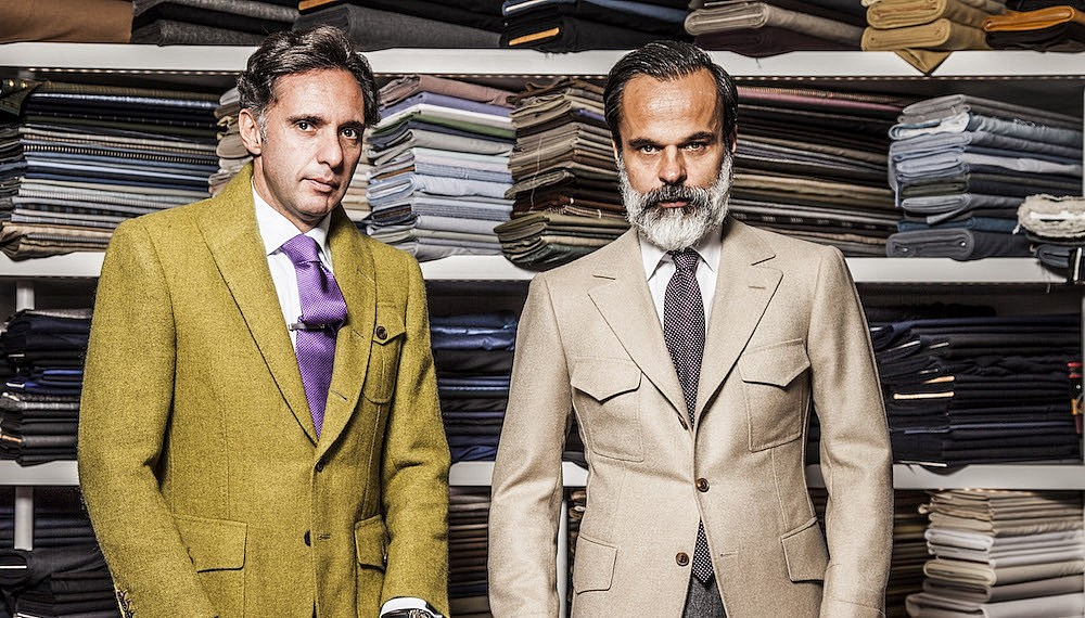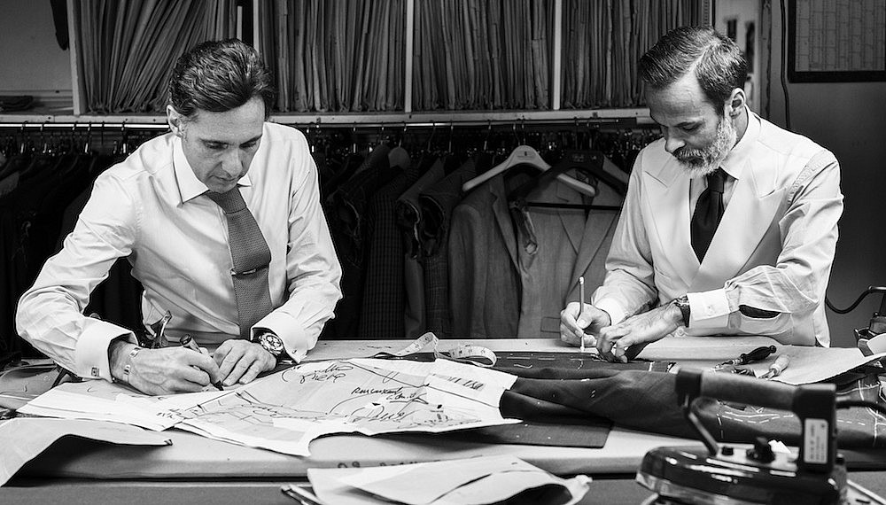 In the 2nd arrondissement, another renowned bespoke house – this one with both Italian and Catalan roots – quietly serves up consistently polished sartorial style to its dedicated clientele. Officially cofounded in 1969 by experienced tailors Mario de Luca and Joseph Camps (ethnically Italian and Catalan, respectively), Camps de Luca helped redefine Parisian menswear style throughout the late 20th century with its signature suits. Distinctive features that have withstood the test of time include the hand-stitched inside teardrop pocket and the iconic Camps de Luca “fish-mouth” notch lapel, which features a deep, wide notch (much like Pac-Man’s mouth). Now, with the de Luca family’s second and third generation tailors at its helm, the house is still thriving thanks to its dedicatedly classic designs and exceptional sartorial methods. At its 16 rue de la Paix workshop, at least five tailors work on a single suit for more than 60 hours before delivering it to the client.