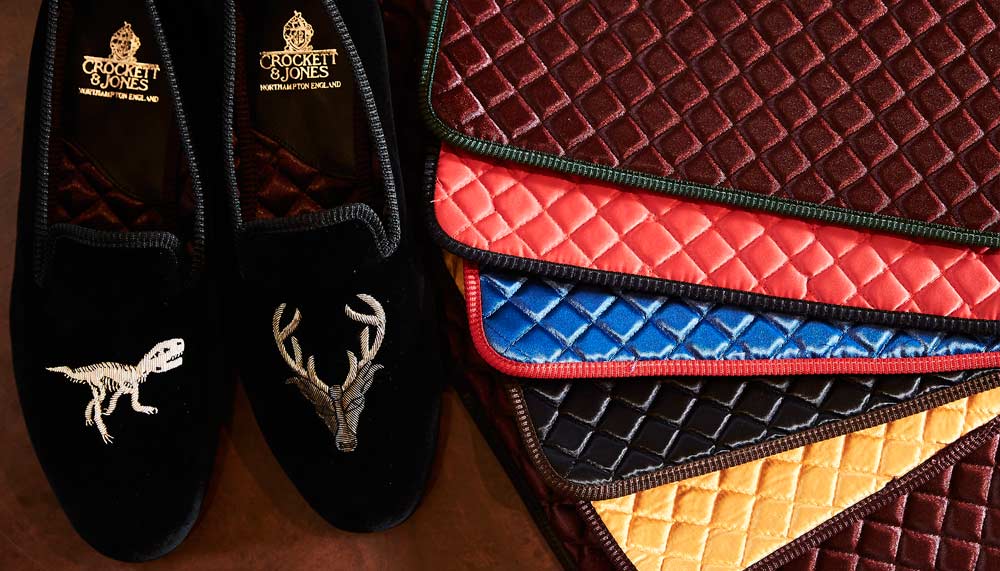 According to Philippa Jones, director of Crockett & Jones, members of social clubs like to have their emblems stitched on too, with fancier gold or silver threads adding to the rather grand effect. The company offers a catalogue of standard designs and letter fonts, but will also draw up artwork of any design a customer might bring in. It embroiders some 200 pairs a year, and more since velvet slippers became something of a fashion look.