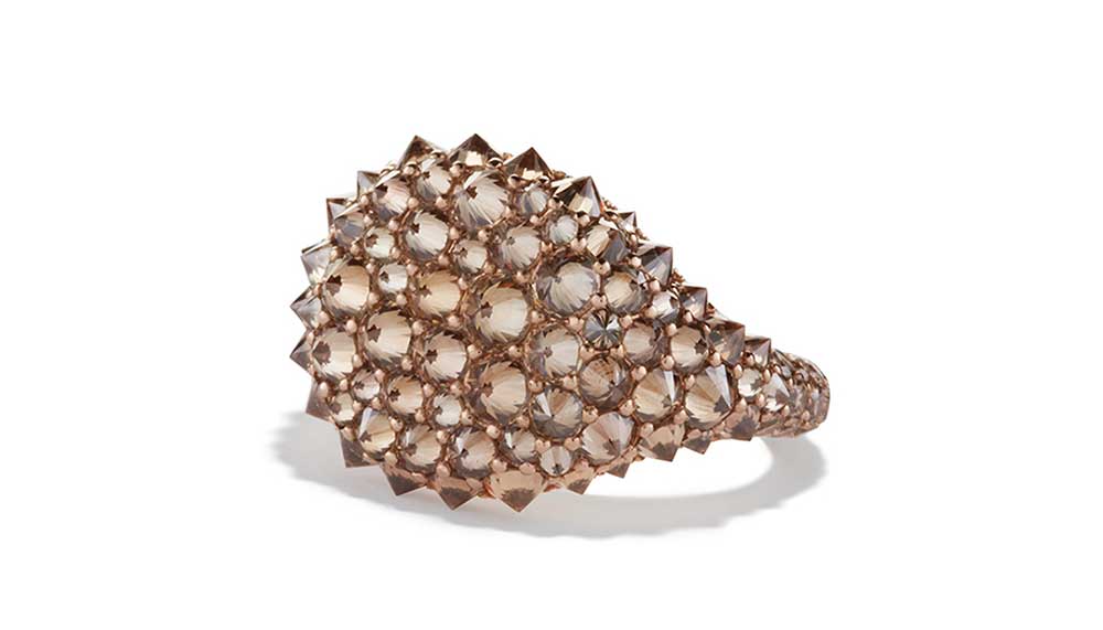 Kirsty Stone, a Los Angeles–based designer who just launched her one-year-old line, Retrouvaí, at Barneys New York, prefers pinkie rings in gold signet styles engraved with unique motifs, including her signature, a flying pig. “I designed my fantasy signets – particularly the Flying Pig motif – with the pinkie in mind,” Stone says. “To me, this finger represents empowerment. The ring finger represents commitment and promise, while the pinkie says: ‘I am fearless and extraordinary.’ Plus, there’s just something a little retro about a statement pinkie ring that lends well to the nostalgia of a signet shape.”