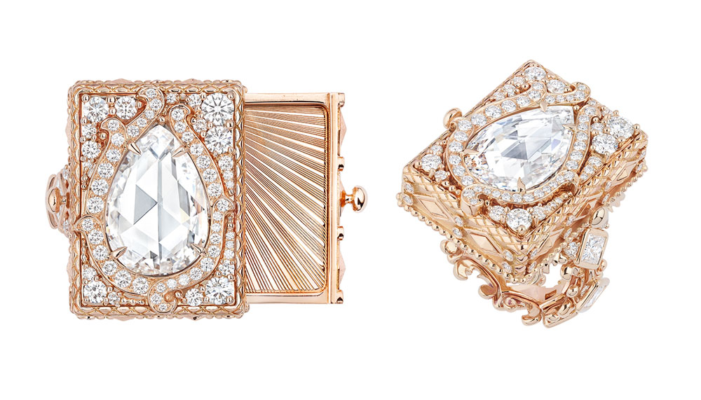 From classic stones like diamonds, rubies, emeralds and sapphires to the more unusual spinels, tanzanites and opals, the Pièces Secrètes jewels come imbued with a strong emotional charge – the passion of a liaison or the flame of an eternal union. There are additional surprises to be found in playful and varied opening systems, such as swivelling caps, sliding drawers and stones that can be lifted up – all specially developed, of course, to create astonish and delight. Even more ingeniously, the mechanisms never open completely, ensuring the mystery of every piece stays in place and is never completely revealed, remaining a lucky charm exclusively for its wearer’s pleasure.