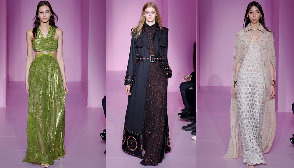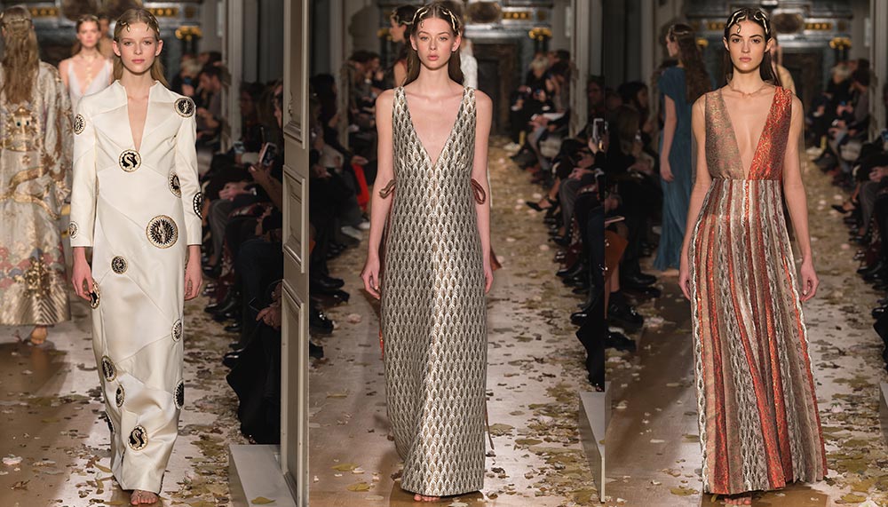 Valentino, on the other hand, drew inspiration from the late Spanish couture designer Mariano Fortuny. Working with his company, the brand recreated Delphos, Fortuny’s iconic floor-grazing dresses in Valentino’s signature hues ranging from moss green to burnt orange. Creative directors Maria Grazia Chiuri and Pierpaolo Piccioli followed up from where they left off during the Autumn/Winter 2015 haute couture collection, with a new medley of exquisite flowy gowns. Embellishment served only to enhance texture: huge butterflies embroidered at the hem of a white velvet gown, butterflies and flowers on a brocade dress of peacock green and gold, strips of velvet sewn onto a sheer tulle confection, and gold stitching on a sage tulle skirt. The most elaborate outfit from this collection took up 2,800 hours to complete.