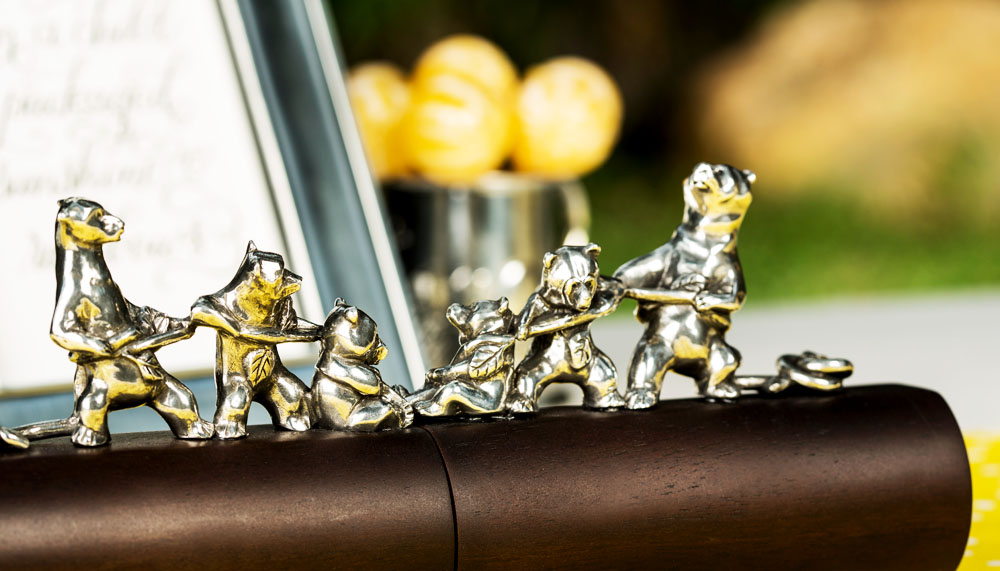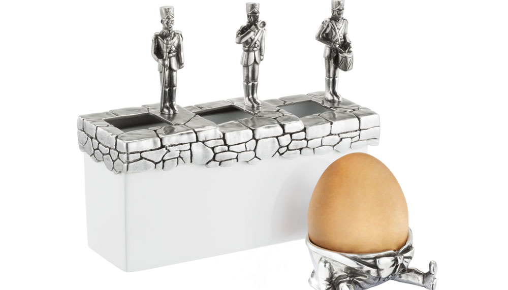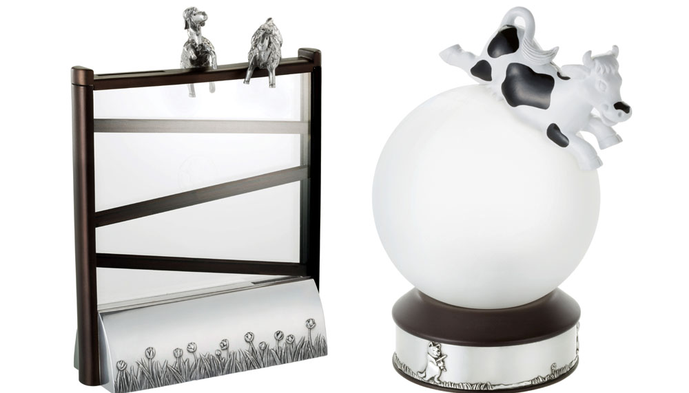 When a newborn arrives, there is Wonderyears, a wonderfully whimsical collection dedicated to classic children tales and nursery rhymes. The Moo Light lamp illuminates the ‘Hey diddle diddle’ jingle, as the cow jumps over the moon. The custom of ‘counting sheep to go to sleep’ doubles as a coinbox, while woodland creatures play tug-of-war atop a document holder. Humpty Dumpty is immortalised as an egg cup, guarded by ‘all the king’s men’, with a mug, spoon and crib medallion rounding out the collection.