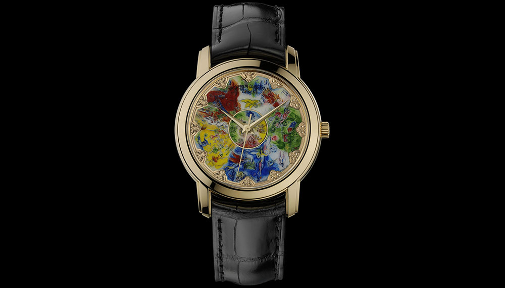 The first watch in the collection was unveiled in 2010, just in time to celebrate the 30th anniversary of the Association pour le Rayonnement de l’Opera National de Paris. Featuring a gorgeous miniature reproduction of Chagall’s fresco done by the traditional Genevan grand feu enamelling technique, the 40mm watch in yellow gold is not for sale and belongs to Vacheron Constantin archives.