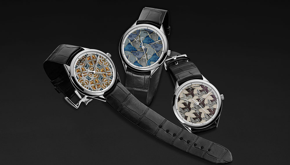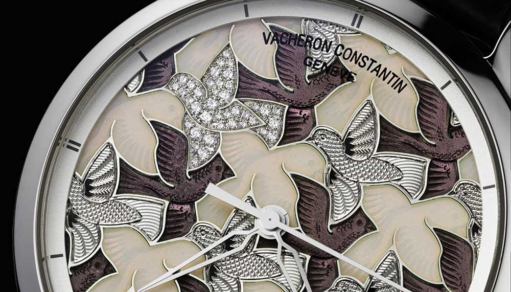 Bringing the artistic style of Escher into its Patrimony collection, Vacheron Constantin designed three pieces, each a limited edition of only 20 pieces, and utilised several different techniques including traditional hand guilloche, figurative engraving, gem-setting and champleve enamelling.