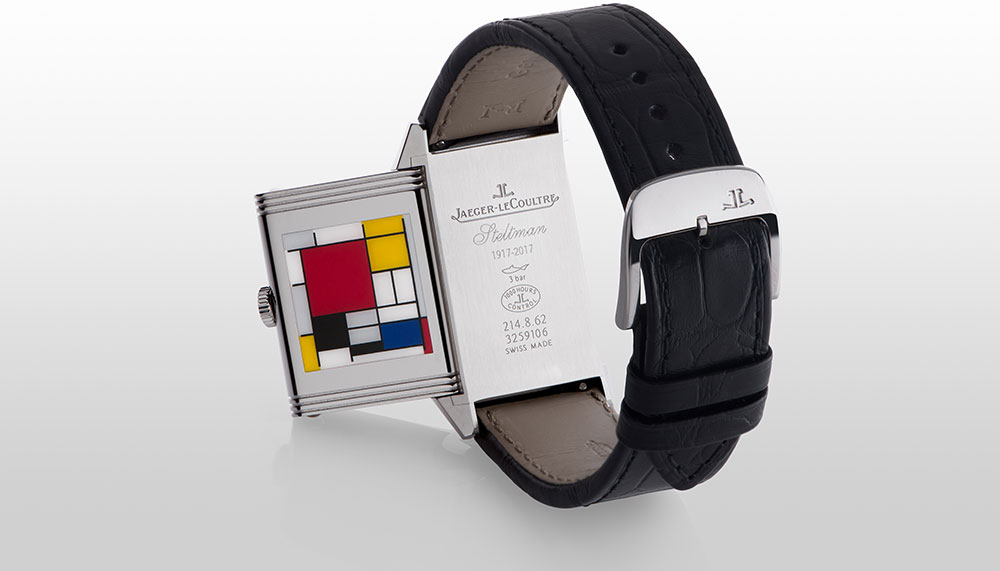 Instantly recognisable, his painting, Composition with Large Red Plane, Yellow, Black, Grey and Blue, features prominently on the caseback of a steel Reverso Classic with small seconds, while an inscription on the back of the case holder marks the 100th anniversary of Dutch retailer, Steltman, with whom the watch was jointly created.