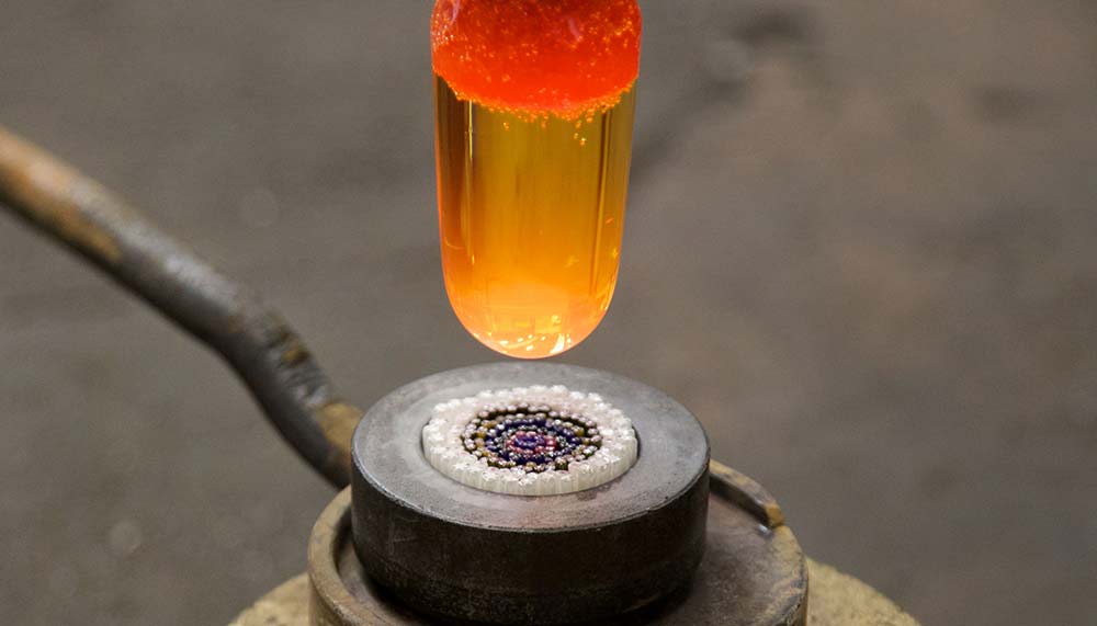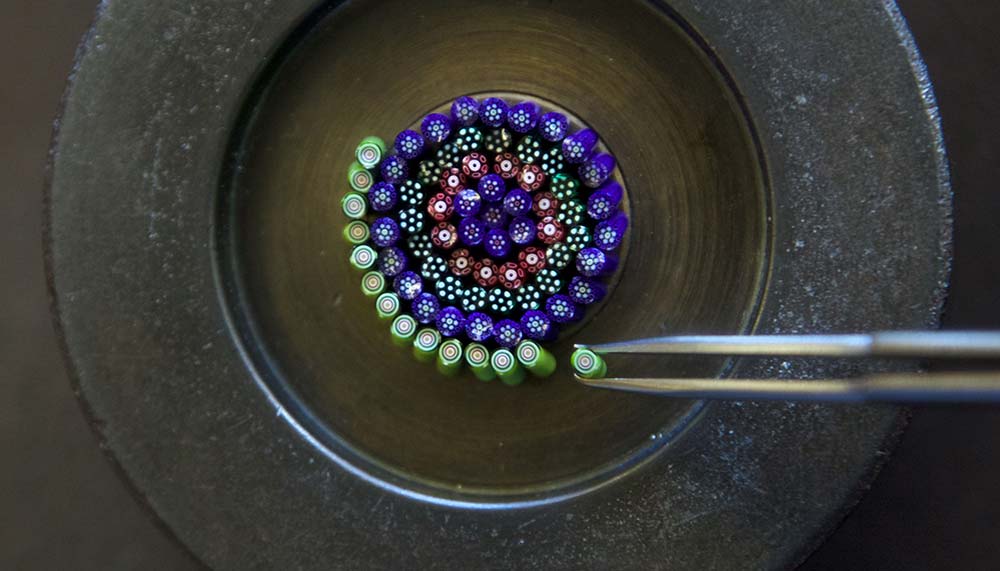 To create the signature millefiori (Italian for ‘a thousand flowers’) motif, glassmakers fashion colourful canes or baguettes out of crystal and enamel that are then cut into 10mm portions and arranged to form a bed of flowers. A clear crystal dome seals the pieces together, and it is only during the final cutting stage that the crystal reveals the full wealth of its pattern and the unique beauty of the flowerbed that will become the dial or cover of one of the Arceau models.