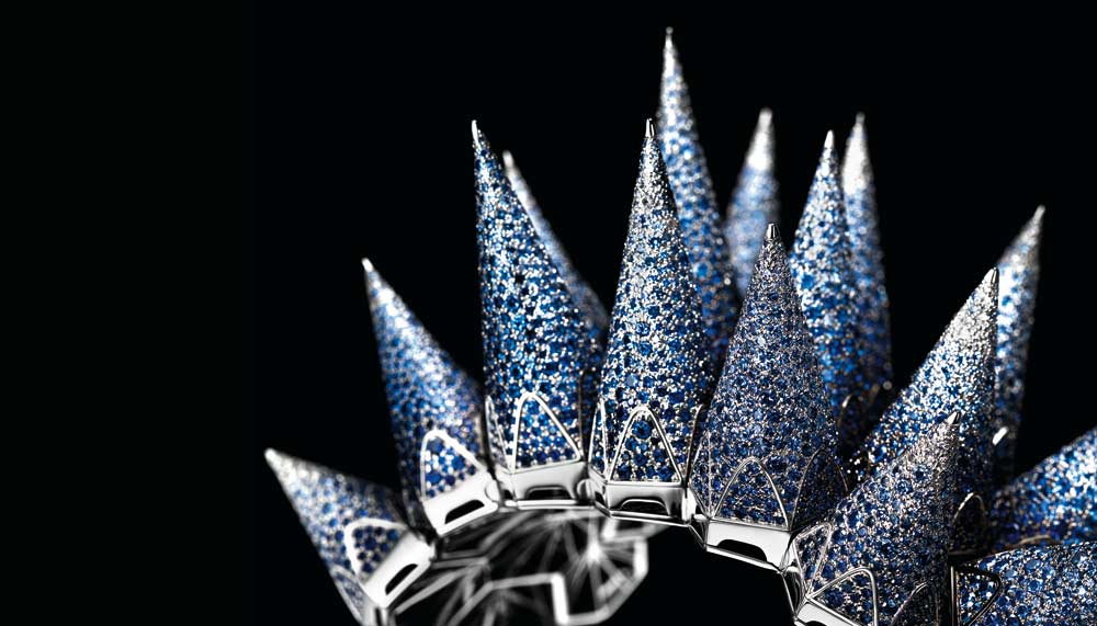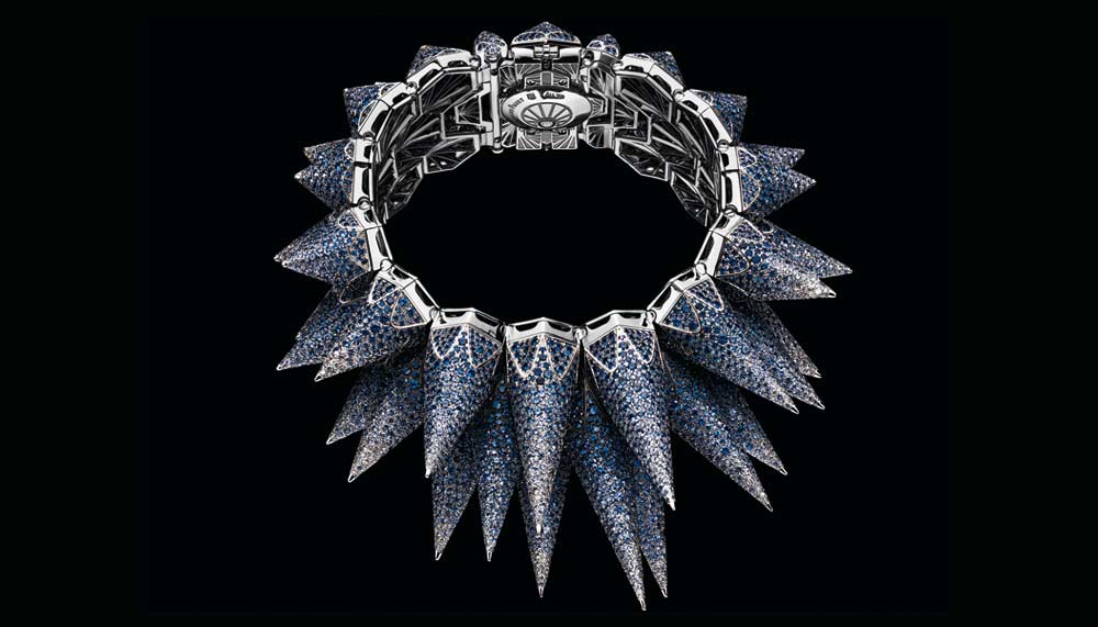 A total of 9,923 brilliant-cut diamonds and 354 baguette-cut diamonds (approximately 65.91 carats) pave the full diamond version, while a whopping 11,043 brilliant-cut blue stones (approximately 65.47 carats) cover the sapphire version. And yes, this breathtaking high jewellery piece also tells the time; two sets of spikes open up, French window-style, to reveal a mirror-polished octagonal dial.