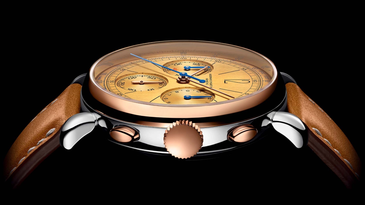 “We wanted to shake things up a little bit,” says Michael Friedman, head of complications at Audemars Piguet. “We didn’t want to create a historical reissue, because we do not make watches today like we did in the 1940s. We took the design and aesthetics of this 1943 chronograph and we modernised it for today.” Aesthetically, it nails the original with its retro champagne dial, olive-shaped pushers, blue tachymeter scale and two-tone pink-gold-and-steel case. There’s even a “45” just above the 30-minute register, which was a request in the 40s from Jacques-Louis Audemars, a serious soccer fan in need of a device to time the length of halves at games.