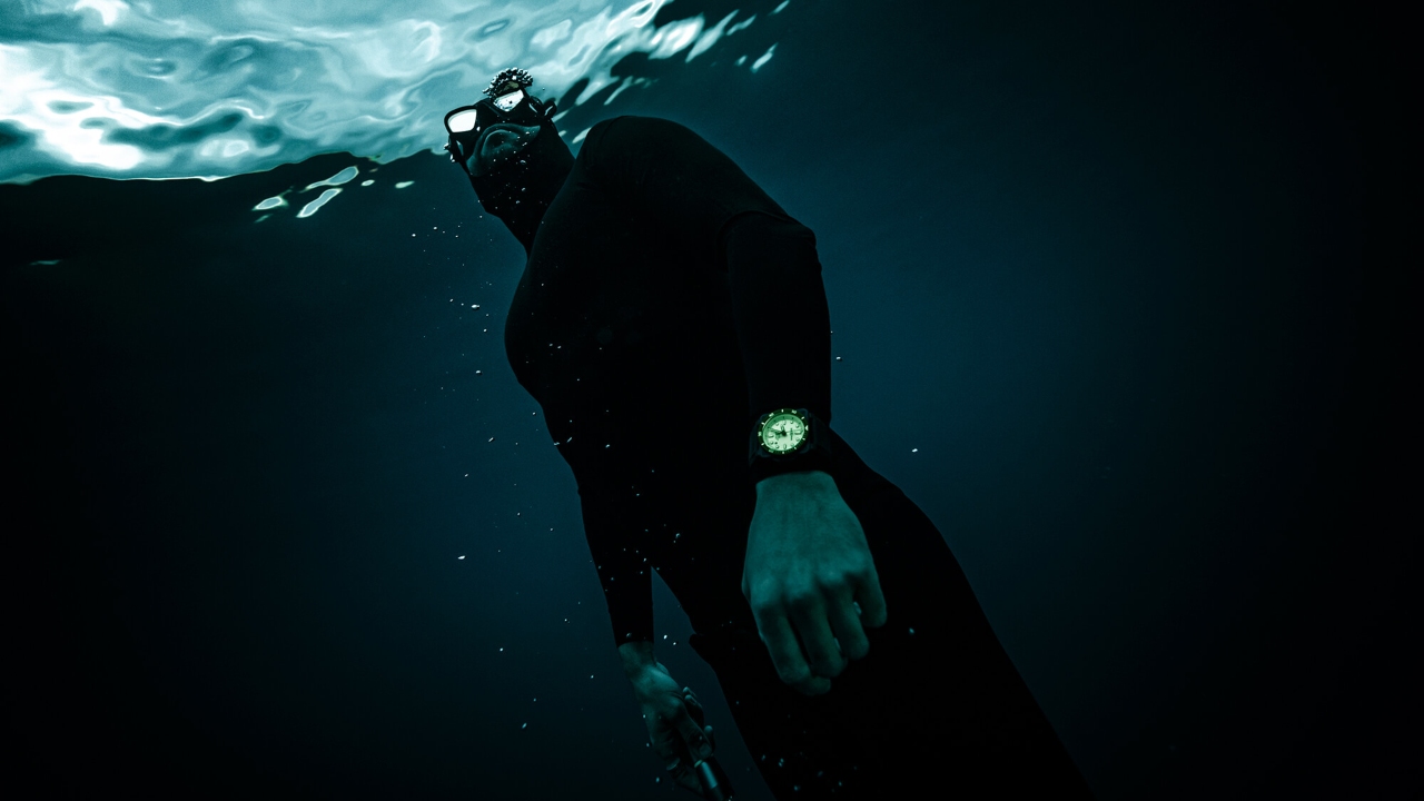 To achieve the necessary brightness when at considerable depths, Bell & Ross adapted its Lum concept to its diving collection and reversed the traditional principles of day and night legibility while also incorporating different shades of luminescence. The dial is fully coated with a paint made of green Superluminova C5 pigments while the metal applique skeletonised indices and the bezel’s numerals are filled with green Superluminova C3. Together they form a striking and functional contrast. This ultra-phosphorescent green has long durability in the dark, offering a continued and easily legible reading of time even when things are pitch black.