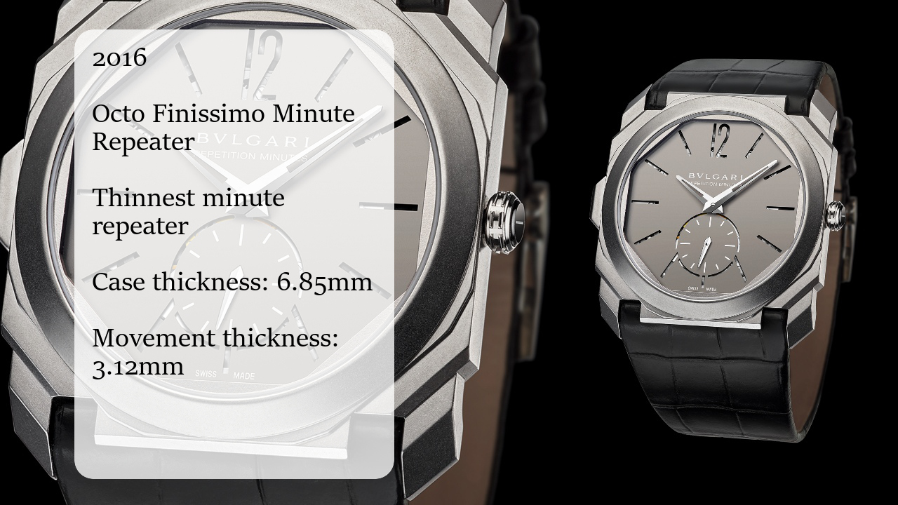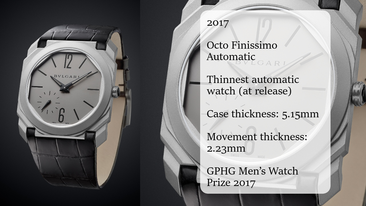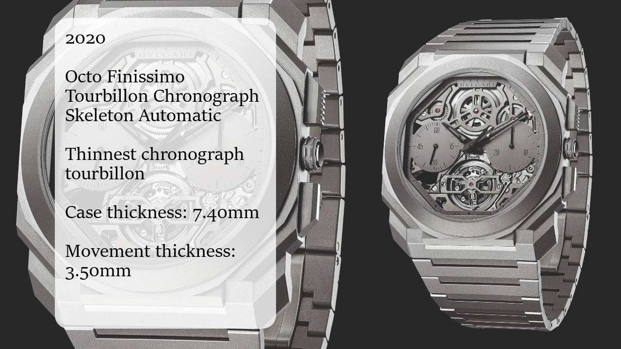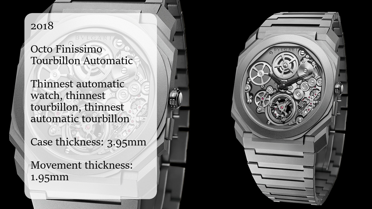 In 2018, Bulgari made its most ambitious release in the Octo Finissimo Tourbillon Automatic, which broke three records at once: thinnest automatic, thinnest tourbillon – these two previously held by past Octo Finissimo models – and thinnest automatic tourbillon.