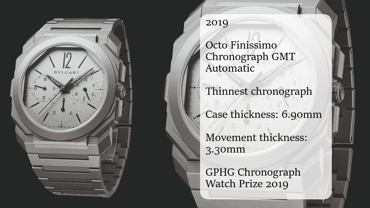 By now, Bulgari’s reputation was building up and the horological community began to wait expectantly to learn what ultra-thin world record the maison would take aim at next. It was the thinnest chronograph in 2019, in the form of the Octo Finissimo Chronograph GMT Automatic. It bagged another GPHG prize as well.