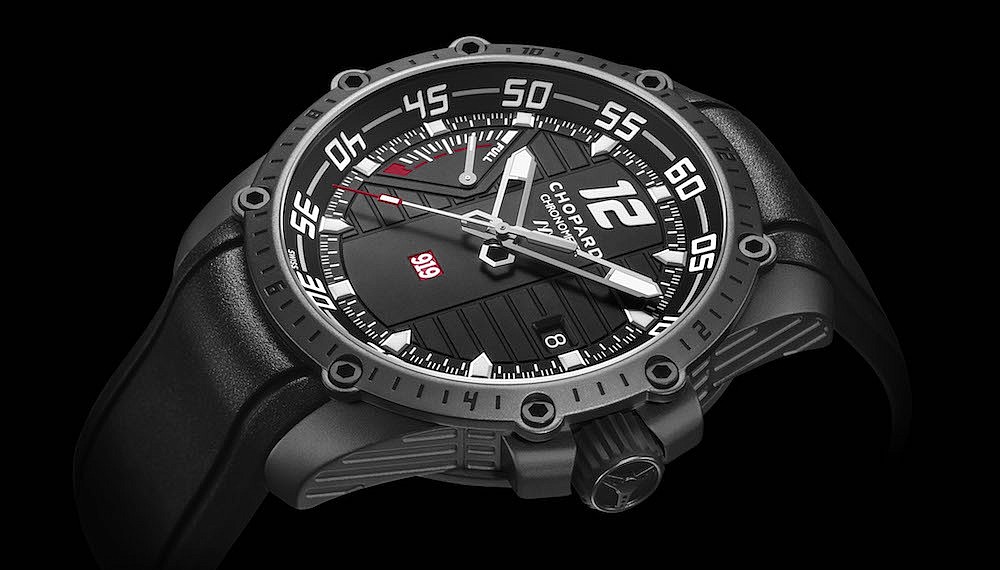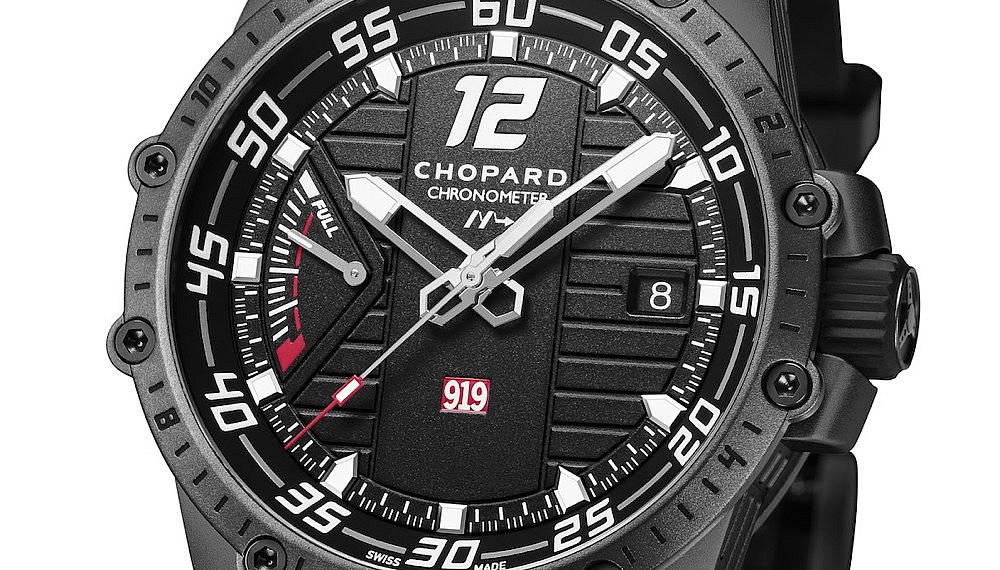 In presentation, the 919 HF is a 45mm case of bead-blasted titanium with a black DLC treatment. The result is a stealthy affair rendered virtually scratchproof, and drawing the eye to the dial within. Legibility comes to the fore with white indexes set against a black background. Red is the only other colour to be found anywhere on the piece, namely on the power reserve scale, the seconds hand, and the background of the numbers 919 — a nod to the winning car. Only 100 919 HF editions are available worldwide exclusively at Chopard boutiques while the Superfast Chrono Porsche 919 Edition – named for the hybrid racer – is available in a numbered series of 919 pieces.