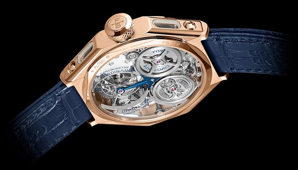 The Chronomètre FB 1 features a dial made from satin-brushed, silver-colored brass, with a blue subdial at 12 o’clock that displays the time — though seconds are marked by a long central hand. This style of offset construction is meant to recall the super accurate marine chronometers that explorers like Malaspina used on their ships to assist with navigation. The power reserve indicator appears at 9 o’clock, while an elongated aperture at 6 o’clock reveals the timepiece’s tourbillon.