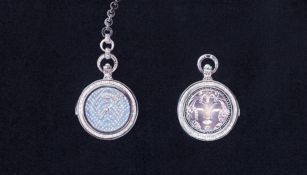 A recess in the centre of the case – where the clock was originally placed – now accommodates a 55mm Parmigiani pocket watch. Crafted from 950 platinum, the PF355 movement manual-winding timepiece evokes the same aquatic motifs as the case. From the front, a whirlpool of bubbles spread across the 18k gold and Grand Feu enamel blue dial. From the back, Arethusa herself is seen; her face framed by two fish in masque de femme style, embellished with, what else, Lalique crystals. The watch itself may be removed from the table clock configuration to be worn with a platinum chain.
