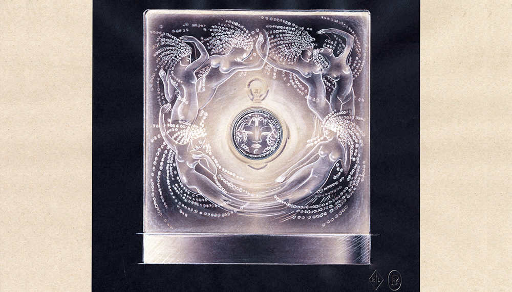 At the age of 75, French glass designer and master jeweller René Lalique decided to illustrate the Greek myth of the sea nymph Arethusa – a chaste attendant to the goddess Artemis – who was pursued by the love-stricken river god Alpheus. To help her escape Alpheus’ attentions, Artemis intervened in the pursuit eventually transforming the nymph into a fresh-water spring in her temple.