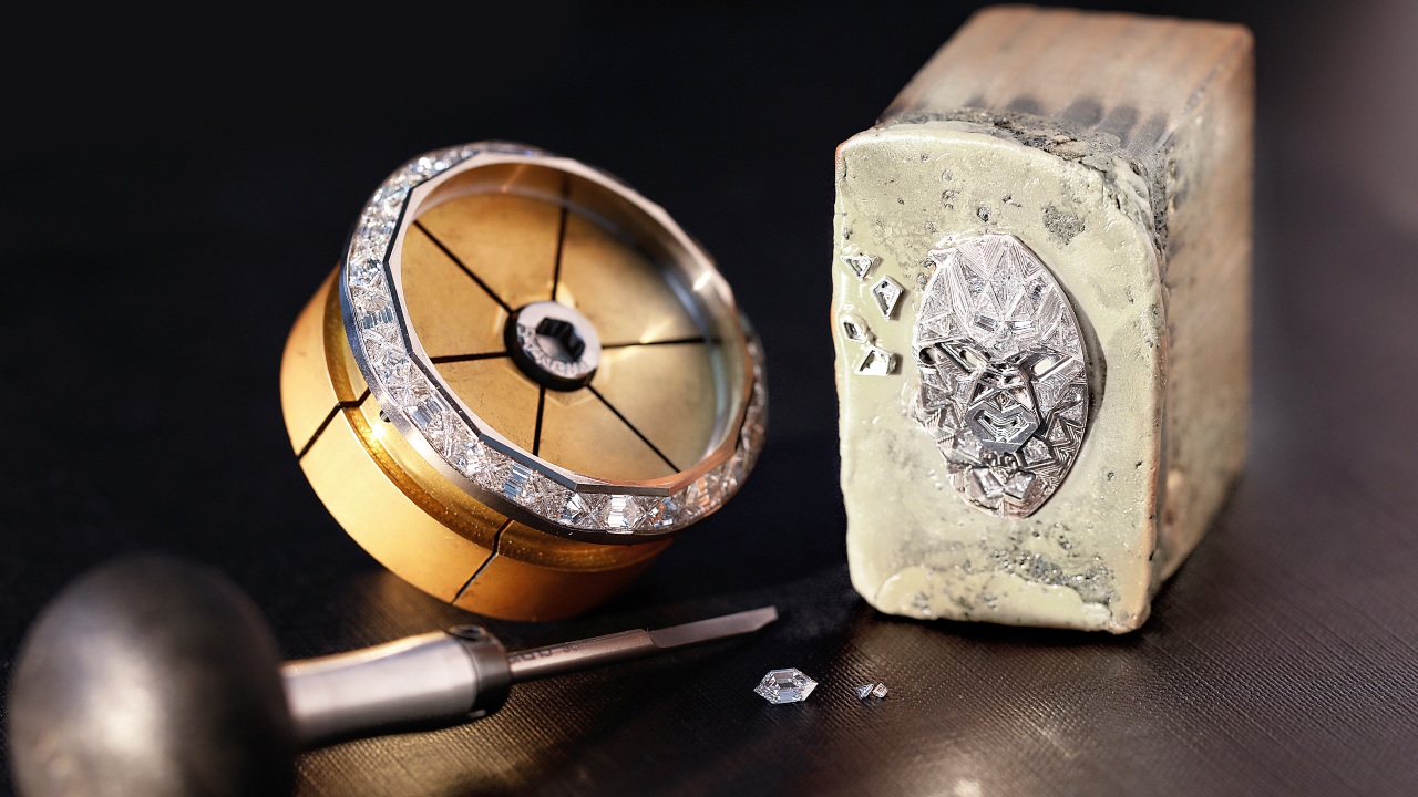 As a blank slate, the Graff Gyrograff is an impressive enough statement piece. The case is a hefty 48mm in diameter, usually studded with diamonds, and it sports some impressive complications: a double-axis tourbillon, and a hand-carved white-gold moonphase indicator, realistic down to the craters. Together, they are quite the three-dimensional visual treat. But that is only the start for the Gyrograff, as the expansive dial is usually a work of art on its own. Past models depict scenes that can veer quite whimsical: cityscapes and world maps to race cars and galaxies, crafted with long-time technique such as gem-setting, enamelling and micro-painting. Needless to say, the level of finishing is what one would expect from a maison known for its exquisite high jewellery.