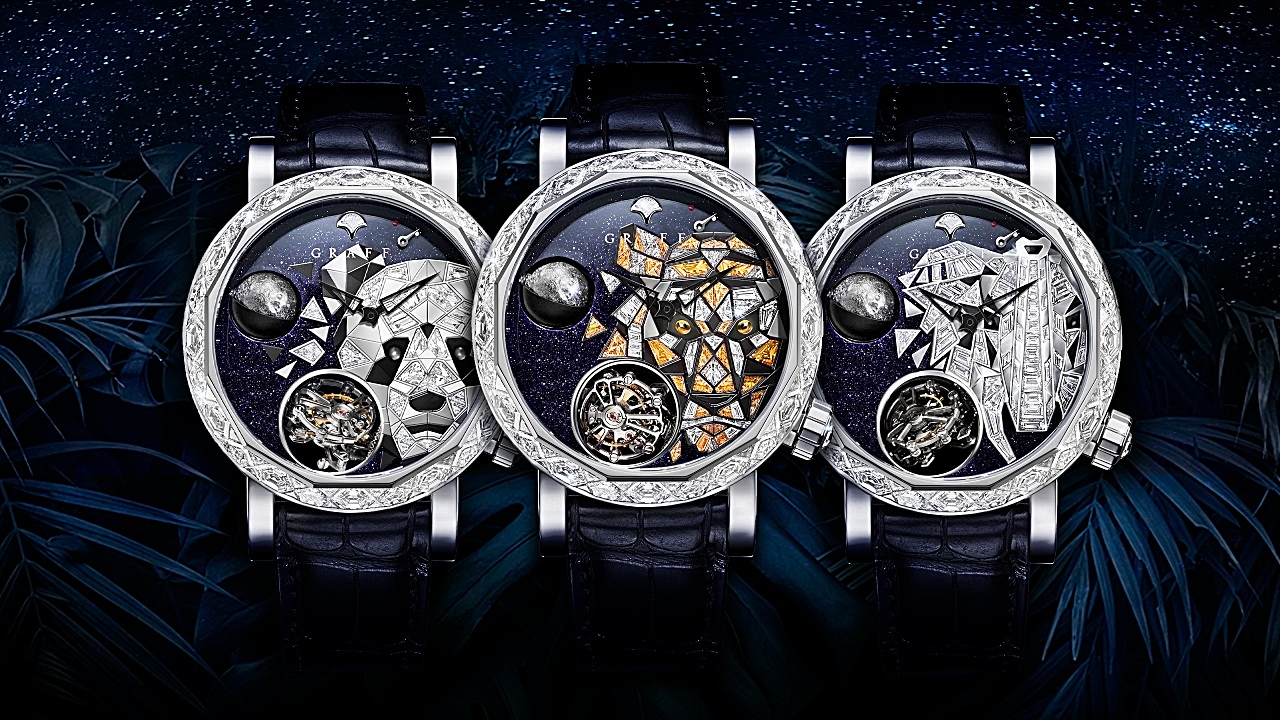 This year sees some of the most intriguing Gyrograff pieces yet, in the Endangered Species collection. On shimmering, dark blue aventurine dials, the likenesses of threatened animal species are depicted using a new technique of diamond marquetry.