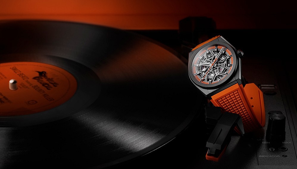 The new watch is a twist on the watchmaker’s Defy Collection — a line of very modern-looking watches that has become a focus for the brand under Tornare’s new direction. Zenith recently launched an all-black version of the Defy in ceramic and followed up that debut with the Zenith Defy Classic Swizz Beatz Edition (US$7,900/~RM33,060), which features a black ceramic case but boasts a bright orange textured rubber strap. A flange ring and central seconds hand also bear Swizz Beatz’s signature colour (his first Zenith watches were also accented in orange). The watch also comes with a rubber-backed black alligator strap with orange stitching — a subtler nod to his favourite hue.