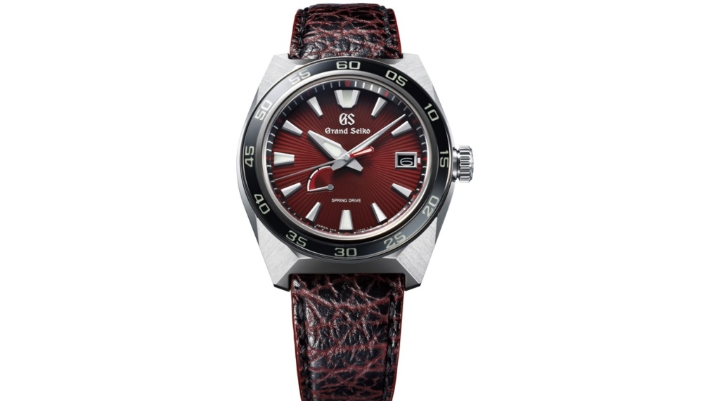 Its burgundy-coloured dial in a sunray pattern, said to mimic the rays of fire emitted from Godzilla’s roars, complements both its legendary movement and its 44.5 mm titanium case. The three-fold-clasp strap is made from sharkskin. The transparent caseback features a black stamp illustrated by Shinji Higuchi, co-director and special effects director for the 2016 movie Shin Godzilla. It combines the monster destroying the Ginza clocktower and Grand Seiko’s lion insignia.