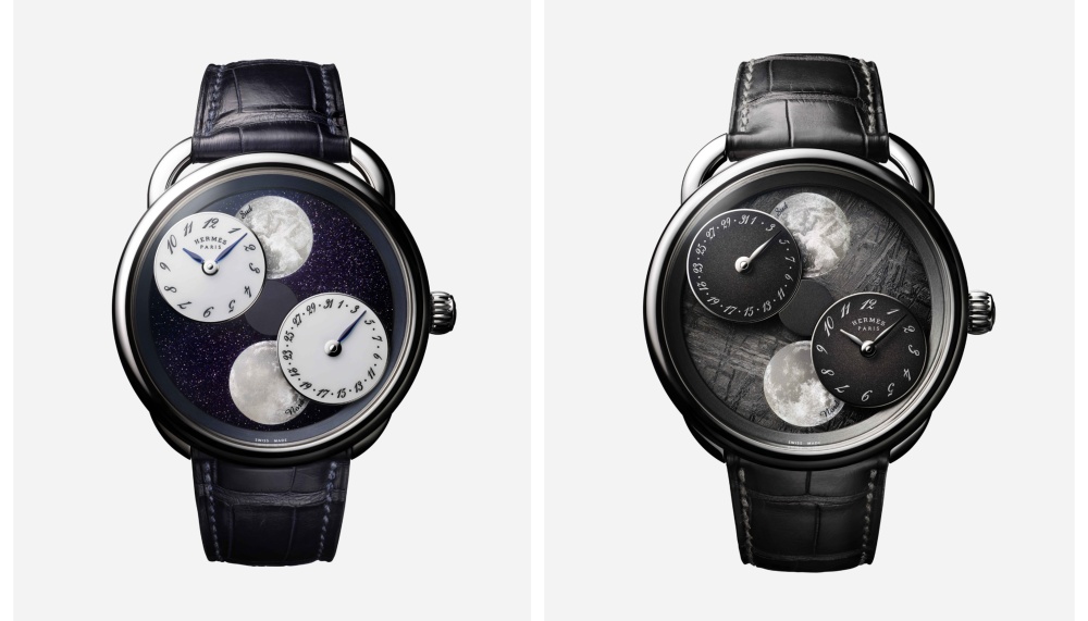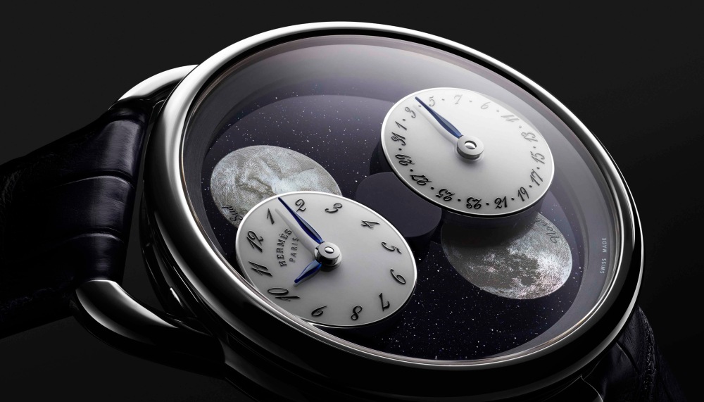 It also has some surprisingly technical watchmaking, with a unique double moonphase complication where the counters themselves indicate the phase: they rotate around the dial to obscure the moons beneath, remaining correctly oriented as they do so. This was possible by Hermes engaging the services of Jean-Francois Mojon and his movement-building specialist studio Chronode. “We had many ideas,” Mojon says. “But the one that was the most interesting was to place the complication at the centre of the watch.” In the final result, the module pivots around a central anchor cleverly concealed beneath a screwless plate that preserves the mystery of the movement.