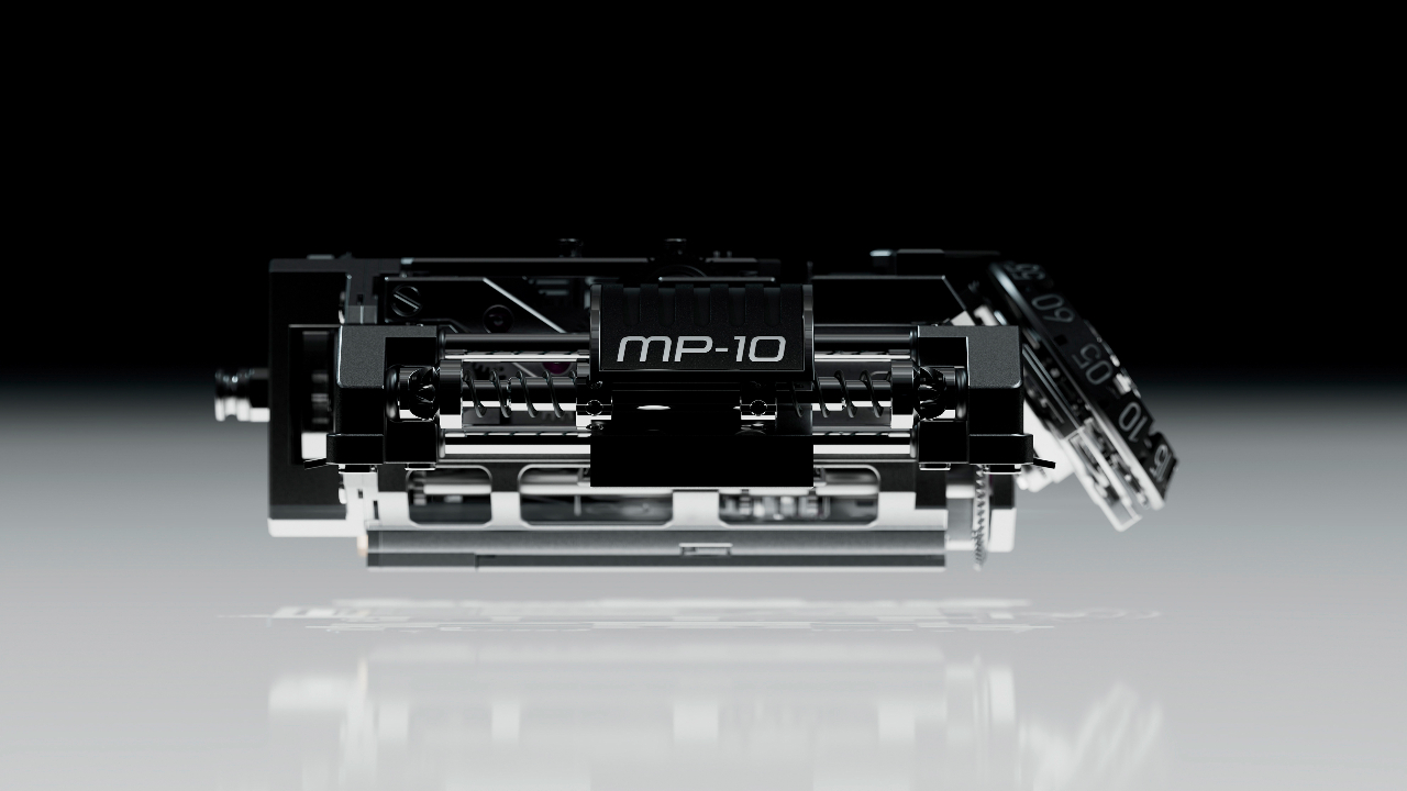 The time-telling has been rethought completely. Instead of hands, the central spine of the MP-10 has a pair of rotating displays for hours and minutes beneath a seamless magnifying section of sapphire crystal. Beneath that is the power reserve indicator, marked in red and green; beneath that is an inclined 3Hz tourbillon with the seconds inscribed directly on the monobloc aluminium cage—a patent-pending application.
