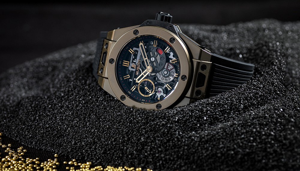 For any gold to be certified as 18 karat, its ingredients must be 75 percent gold in weight and 25 percent other alloys such as nickel, platinum, copper, etc. For Magic Gold, the 25 percent “other” alloy is boron carbide, which begins as ceramic powder. The ceramic powder melts at extremely high temperatures, which watch moulds cannot sustain. So, Hublot changed the process of fabricating the material.