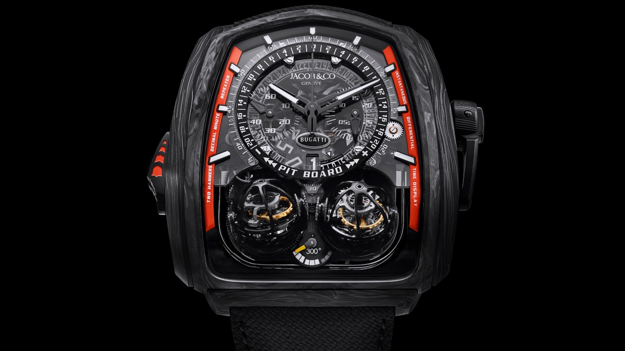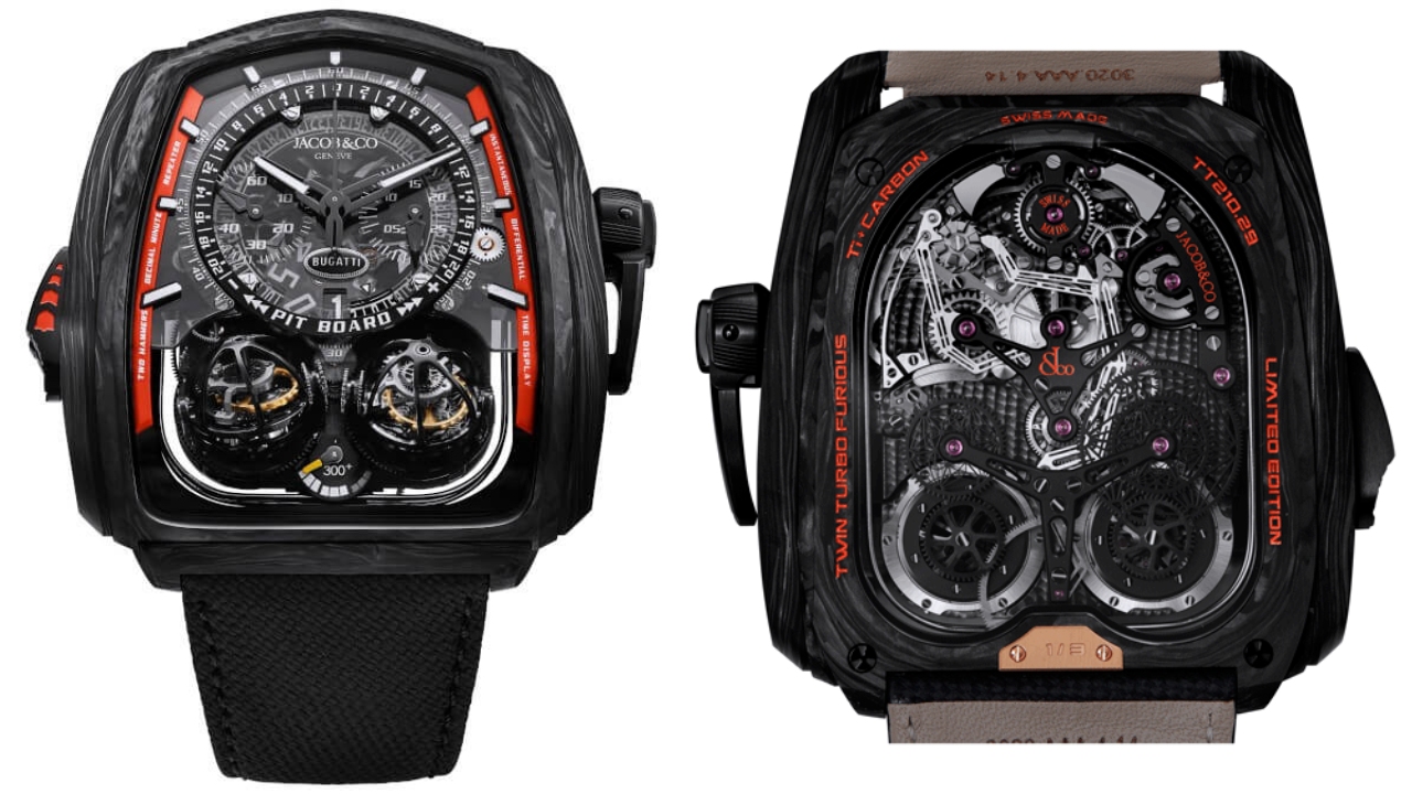 Last August, Bugatti unleashed a souped-up version of its Chiron supercar on the Ehra-Lessien test track in Germany, with factory test driver Andy Wallace behind the wheel. Epic does not begin to describe what happened next. Not only did the car break the mythical 300 mph barrier (304.773 mph, to be exact), it inspired the French carmaker to build the Bugatti Chiron Super Sport 300+, a production model available in a limited edition of 30 examples—which now, thanks to Jacob & Co., has its own commemorative watch, the Twin Turbo Furious Bugatti 300+.